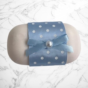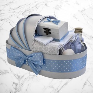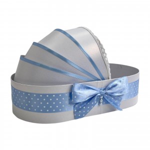 Toate elementele trusoului sunt așezate într-o cutie albă din carton, în formă de landou, decorată cu fundă și perlute.