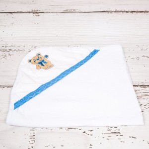 👼 Pânză de mir albă – din bumbac subțire, brodată cu un ursuleț bleu;