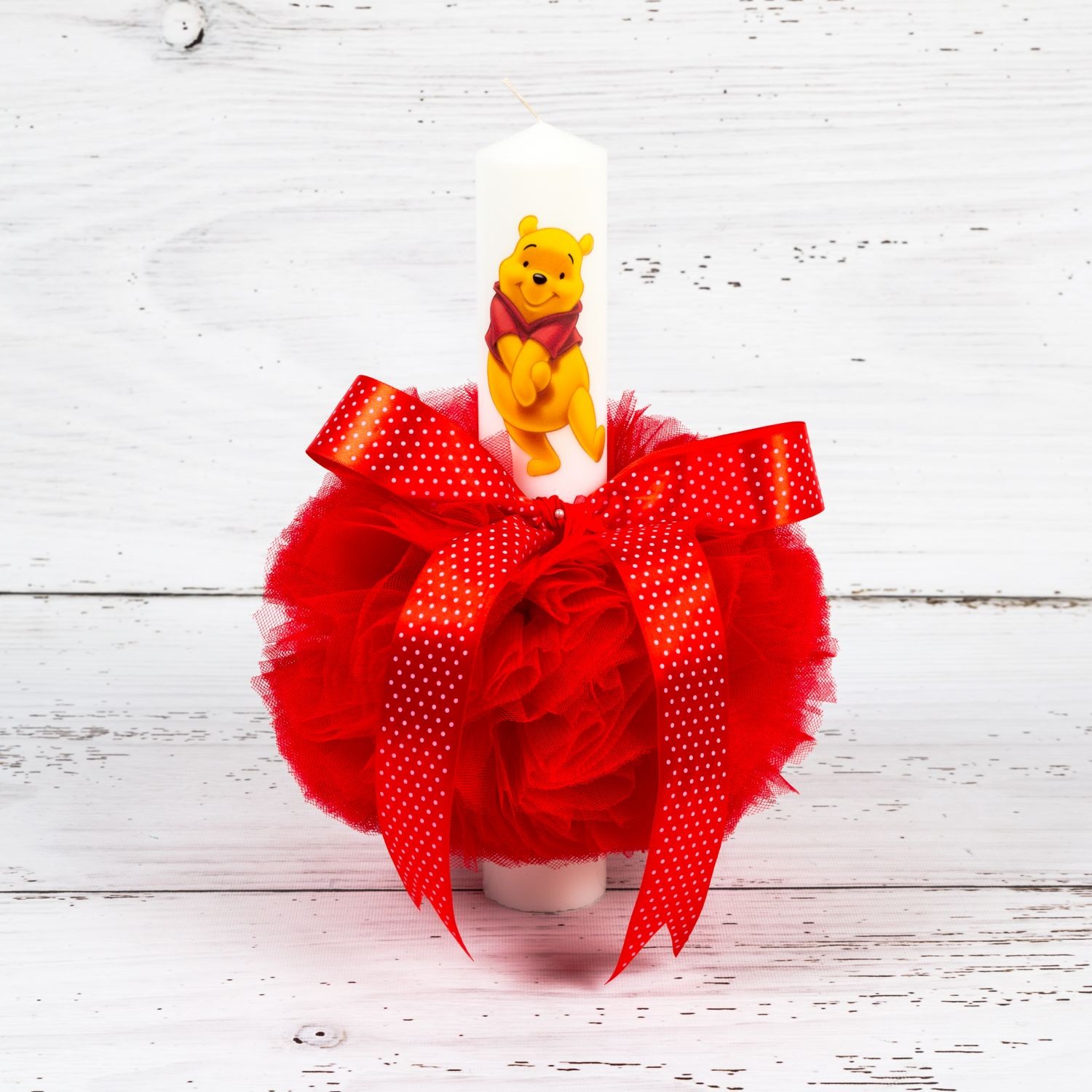 Lumanarea de botez cu tulle rosu, panglica asortata si imaginea lui Winnie The Pooh va fi tinuta de nas in timpul ceremoniei religioase. In mod simbolic, flacara ei simbolizeaza credinta crestinilor in Dumnezeu, dar si lumina sfanta. Inaltime: 35 cm. Diametru: 5,5 cm.