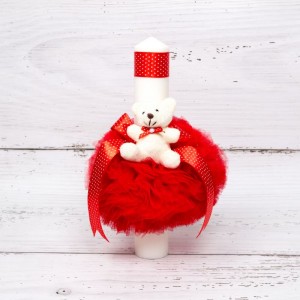 Lumanarea botez cu pampon rosu de tulle, ursulet plus detasabil si fundita rosie cu buline este decorata manual. Aceasta simbolizeaza lumina care o va ghida in viata pe micuta crestina. Aceasta are urmatoarele dimensiuni: 33 cm inaltime, diametru 5 cm.