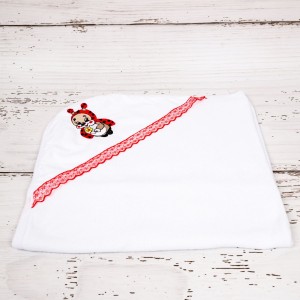 - Prosop cu capison pentru bebelus, folosit pentru scoaterea bebelusului din cristelnita, imediat dupa botez. Prosopul are o gargalita simpatica pe capison cu bordura rosie din dantela la baza triunghiului. Dimensiuni: 80x75 cm.