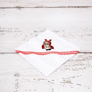 - Panza de mir din bumbac, cu model gargarita si bordura dantela rosie. Pe fasa este asezat copilul dupa botez. Dimensiuni: 104x94 cm.