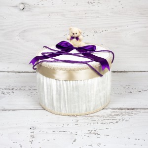 Cutia pentru hainute are baza rotunda si este decorata manual cu ursulet plus, funda mov si are maner asortat din sfoara pentru facilitarea transportului. Dimensiuni: 30 cm diametru, inaltime 23 cm.