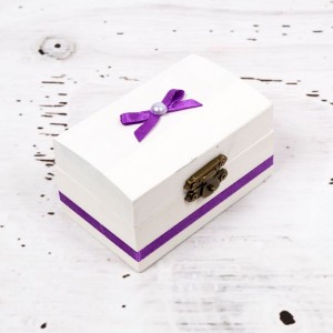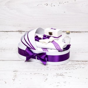Cutia din carton alb cu decor mov are rol estetic, dar si practic. Cutia in forma de landou in care sunt ambalate produsele este decorata manual in Atelierul SelfEvents.ro cu deosebita grija pentru detalii. Landoul este de efect datorita formei deosebite, cat si a decorului creativ. Cutia este in ton cu piesele din trusou.