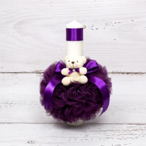 Lumanarea de botez cu pampon din tulle mov, funda asortata si ursulet din plus este folosita la biserica in timpul slujbei religioase. Lumina lumanarii simbolizeaza drumul pe care il va alege in viata copilasul, cu ajutorul calauzei sale primita la botez, ingerul pazitor. Lumanarea din ceara are o inaltime de 35 cm si diametrul de 5,5 cm.