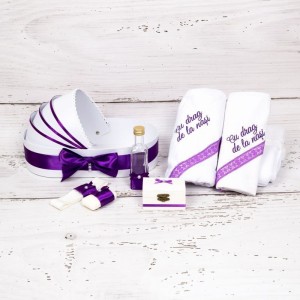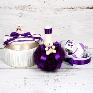 Setul de botez format din cutie trusou pentru hainute, lumanare si trusou botez cu decor mov este alegerea perfecta pentru botezul unei fetite. Cele 3 articole care formeaza acest set (trusoul, cutia pentru trusou si lumanarea) vor fi folosite la biserica.