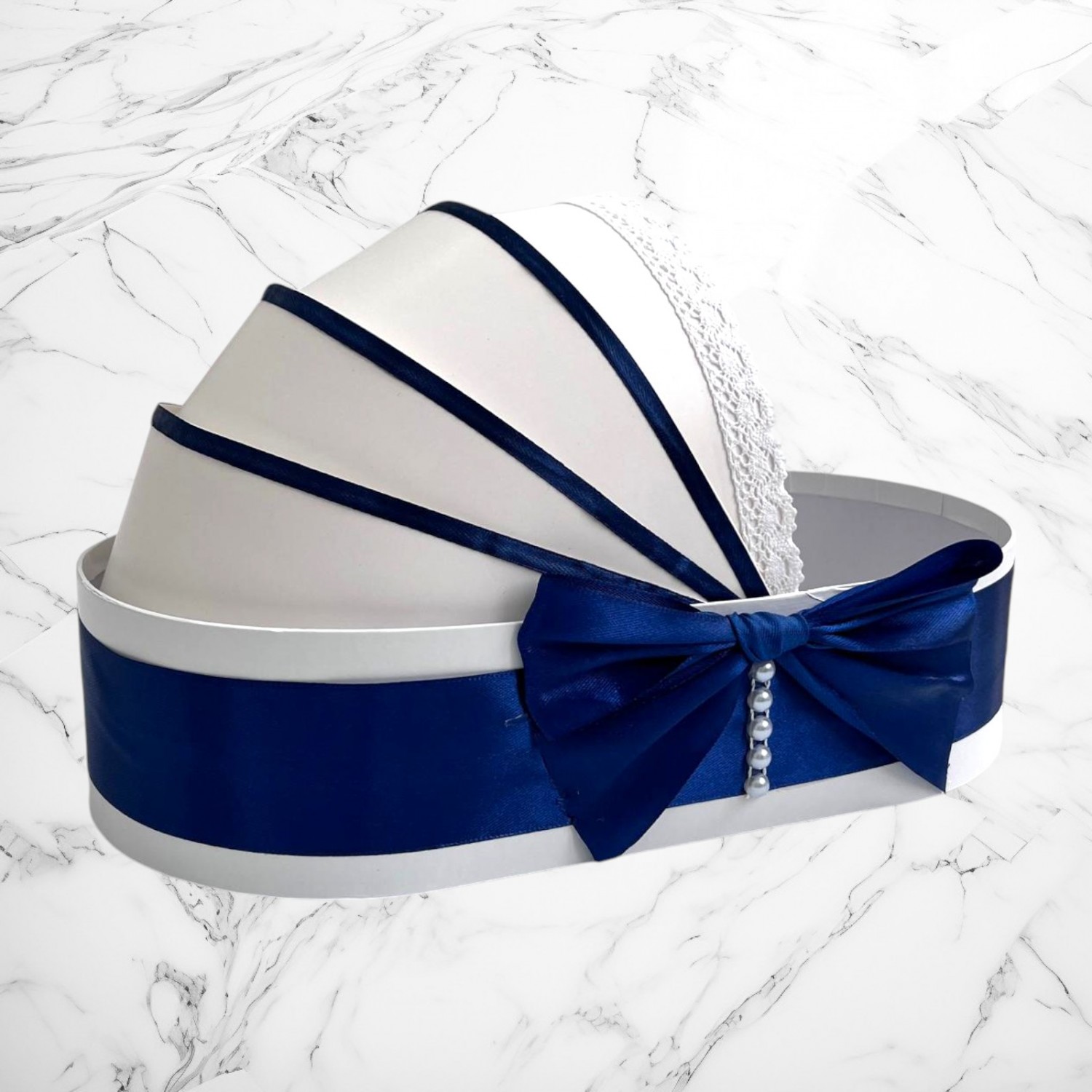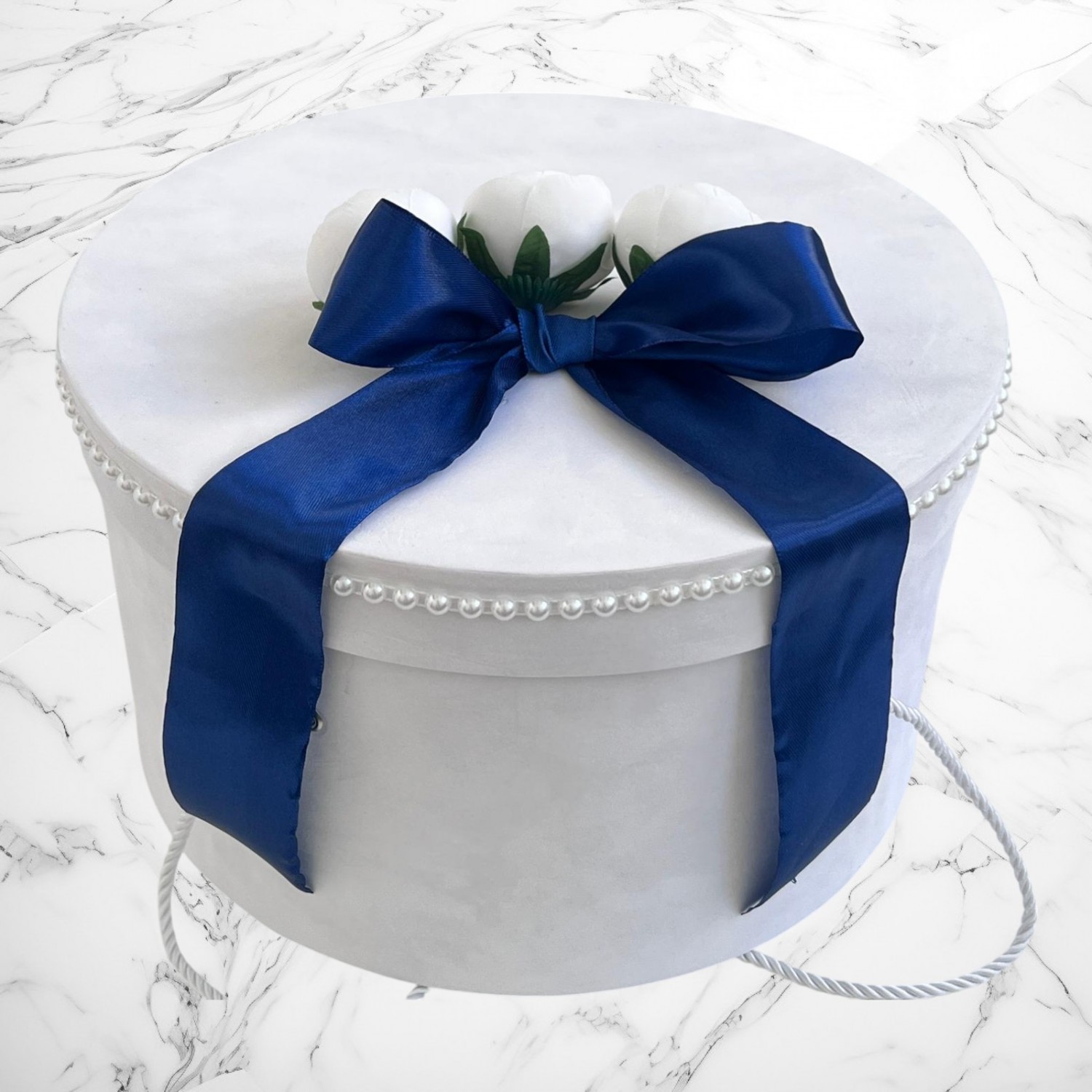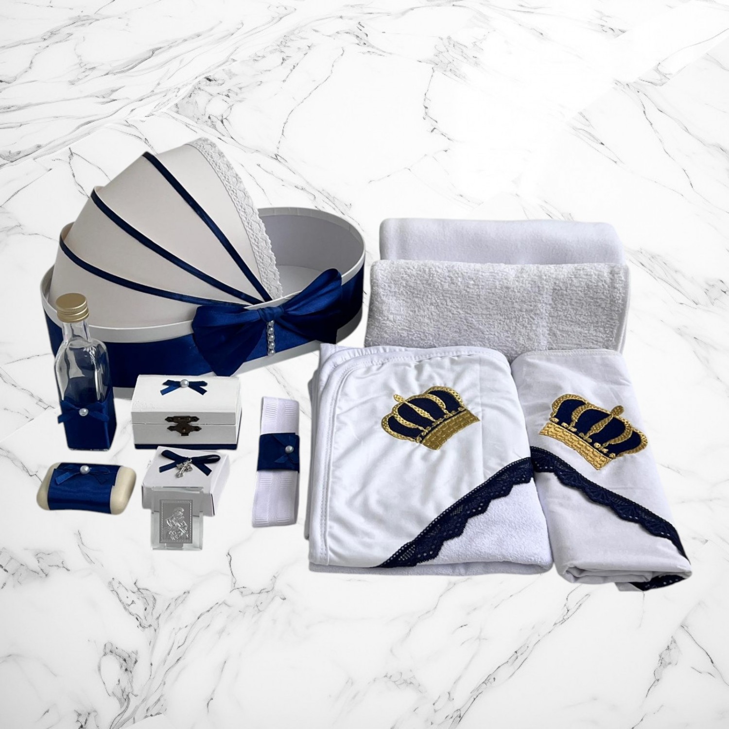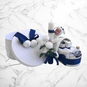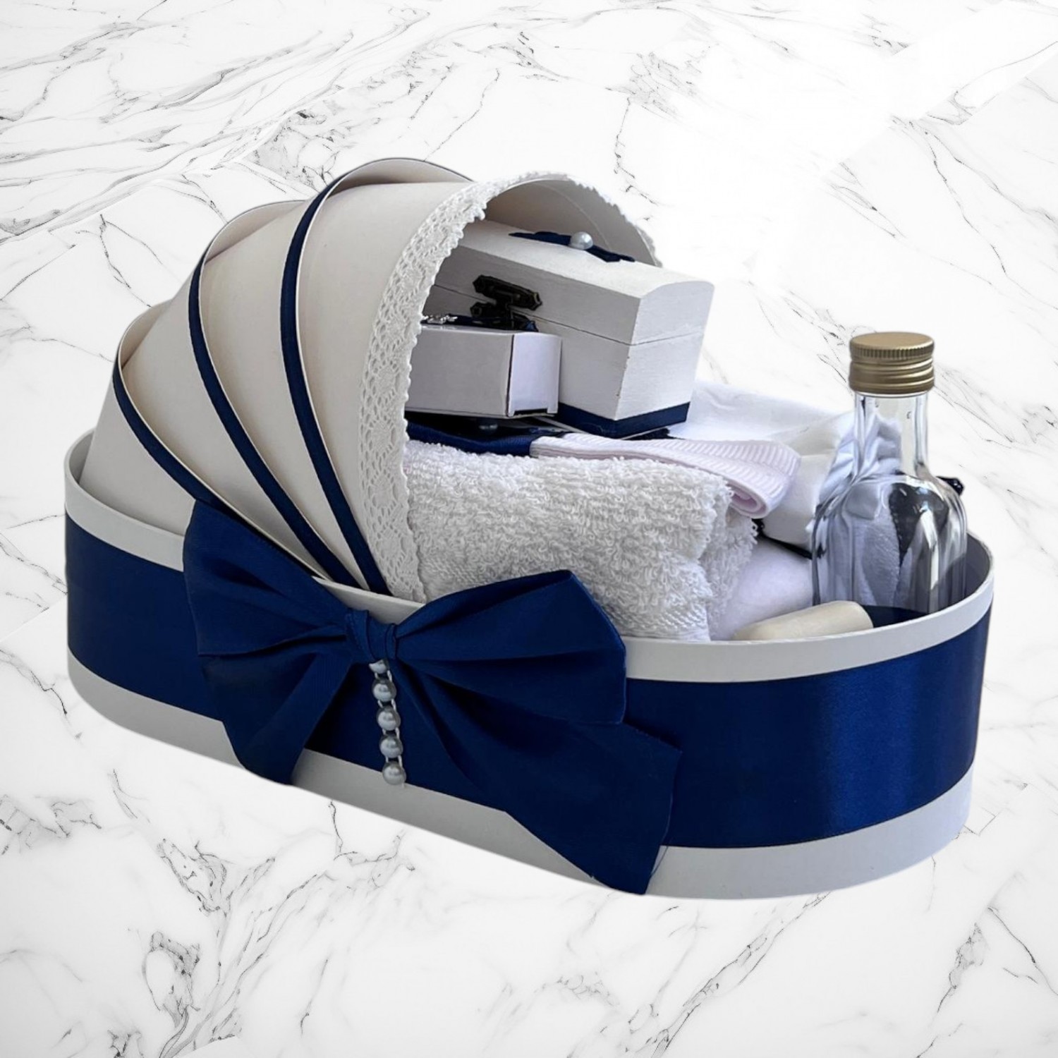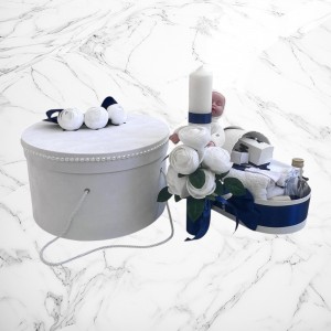 📦 Ambalaj: Toate elementele trusoului sunt așezate într-o cutie albă din carton, în formă de landou, decorată cu fundă și perlute