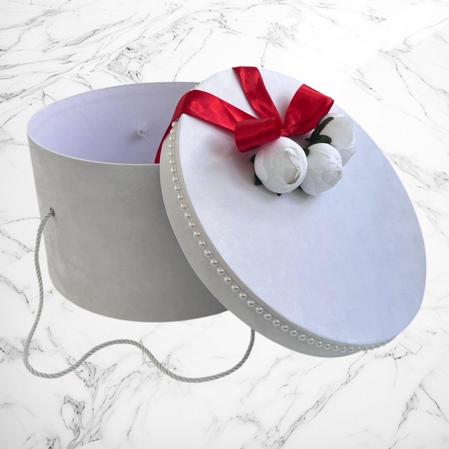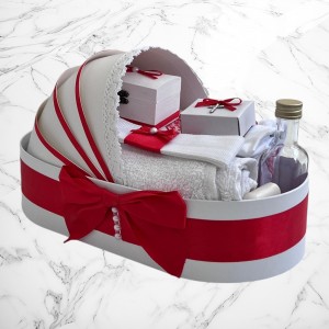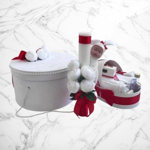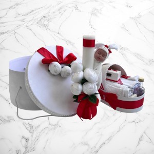 📦 Ambalaj: Toate elementele trusoului sunt așezate într-o cutie albă din carton, în formă de landou, decorată cu fundă și perlute