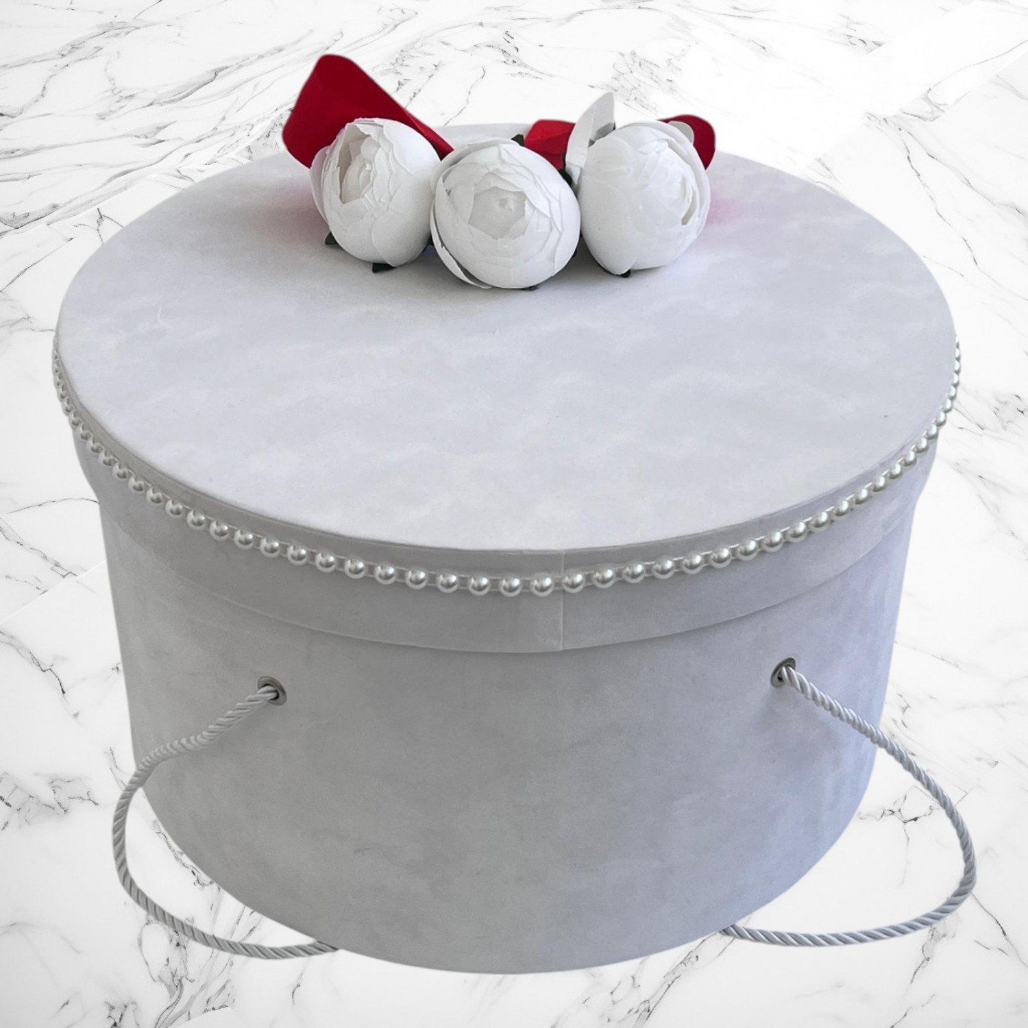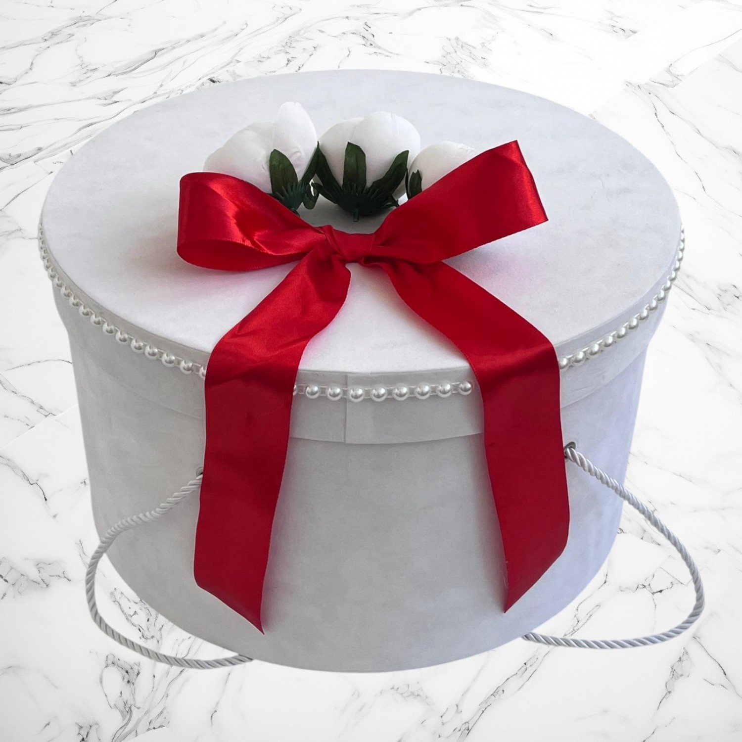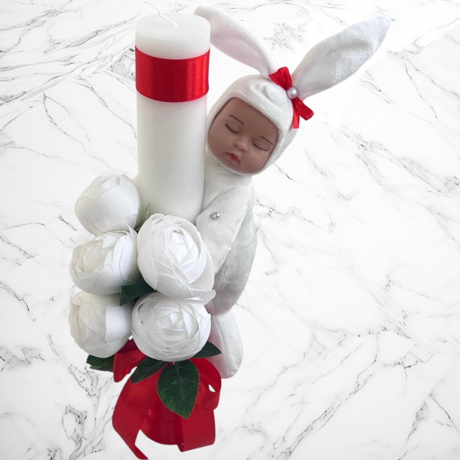 Decor: Manual, cu bujori artificiali, panglică din satin și bebeluș de pluș detașabil