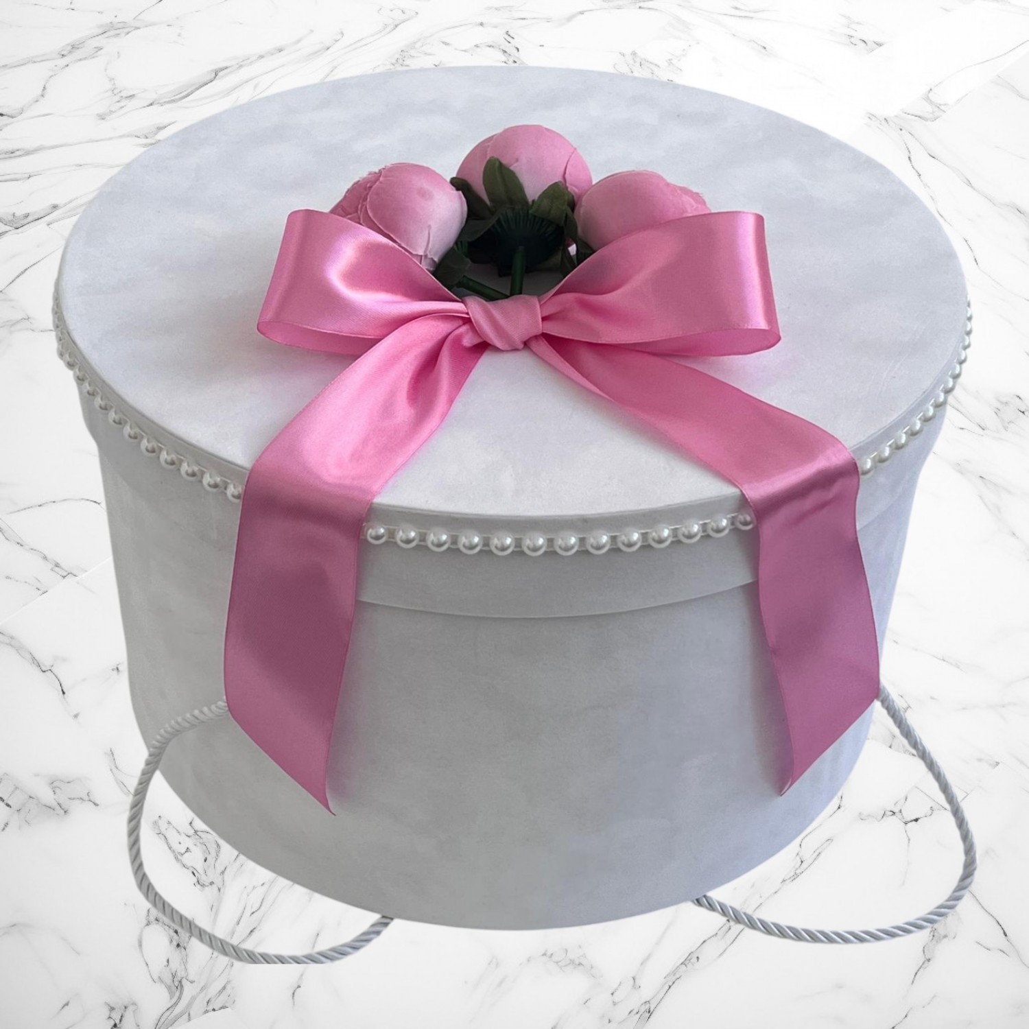 Decor: Manual, cu bujori artificiali, panglică din satin și bebeluș de pluș detașabil