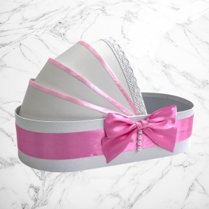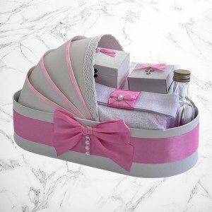 📦 Ambalaj: Toate elementele trusoului sunt așezate într-o cutie albă din carton, în formă de landou, decorată cu fundă și perlute