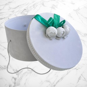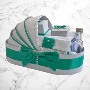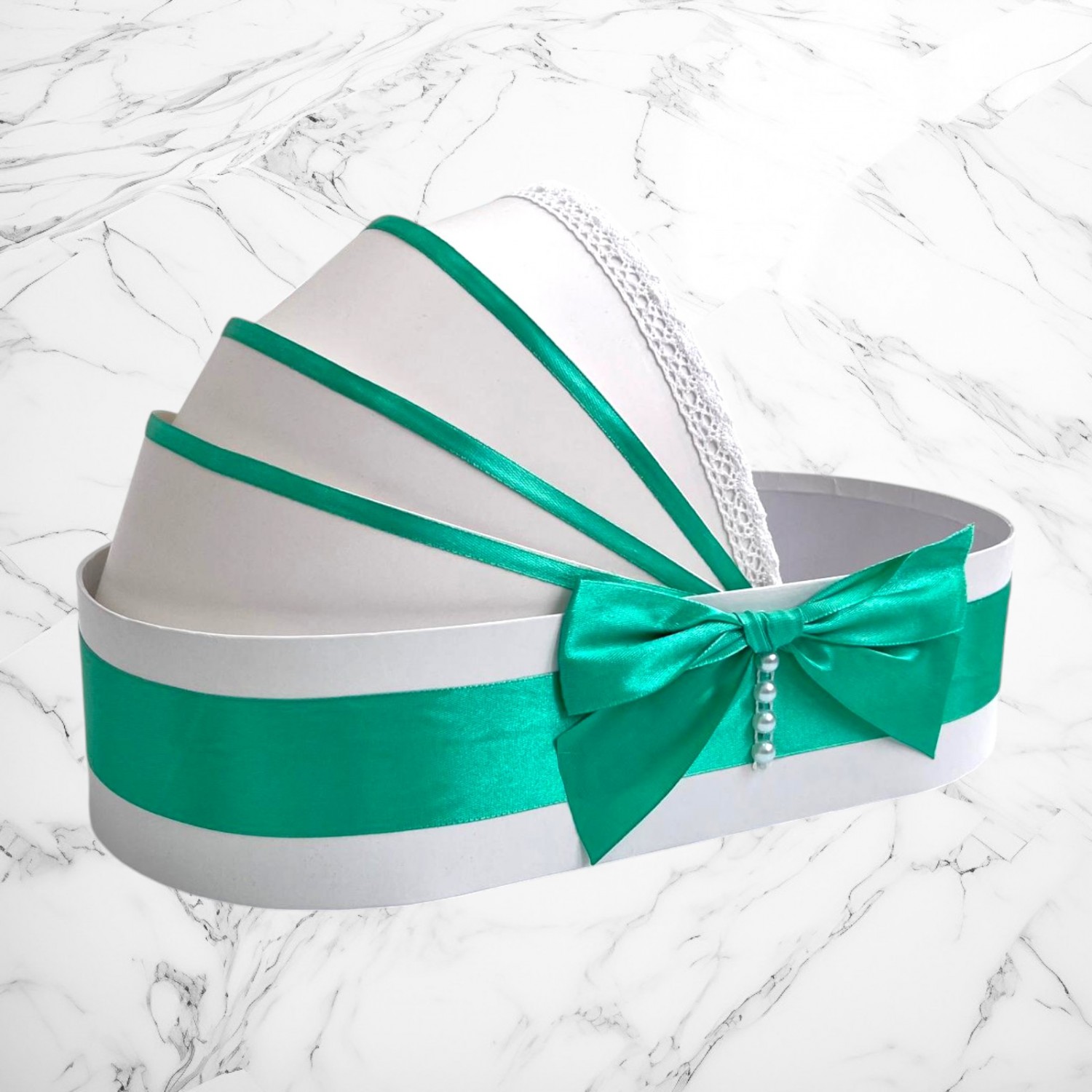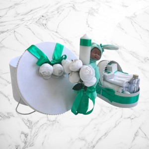 📦 Ambalaj: Toate elementele trusoului sunt așezate într-o cutie albă din carton, în formă de landou, decorată cu fundă și perlute