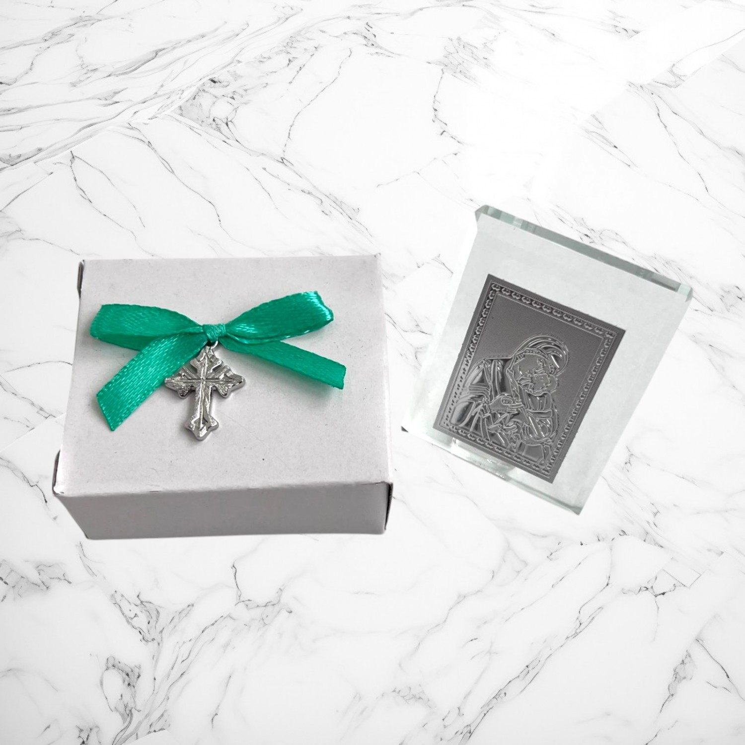 🙏 Mărturie iconiță cu Maica Domnului și pruncul Iisus – realizată din foiță de aluminiu lipită pe sticlă.