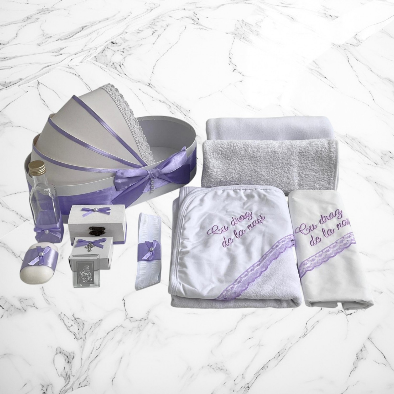 📦 Ambalaj: Toate elementele trusoului sunt așezate într-o cutie albă din carton, în formă de landou, decorată cu fundă și perlute
