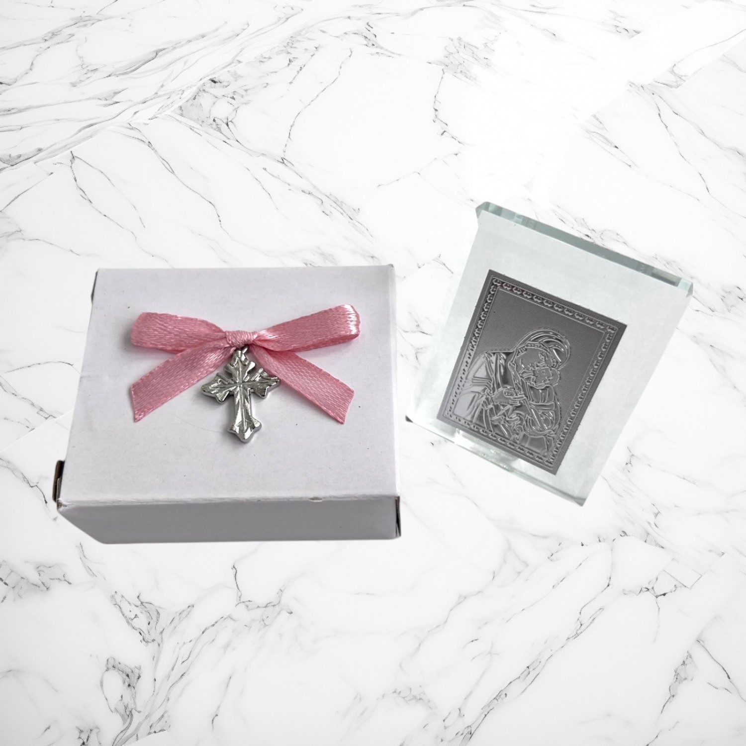 Comanda acum produsul "Set botez Lumânare, Trusou, Cutie hainuțe Cu drag de la nași – roz pudră".