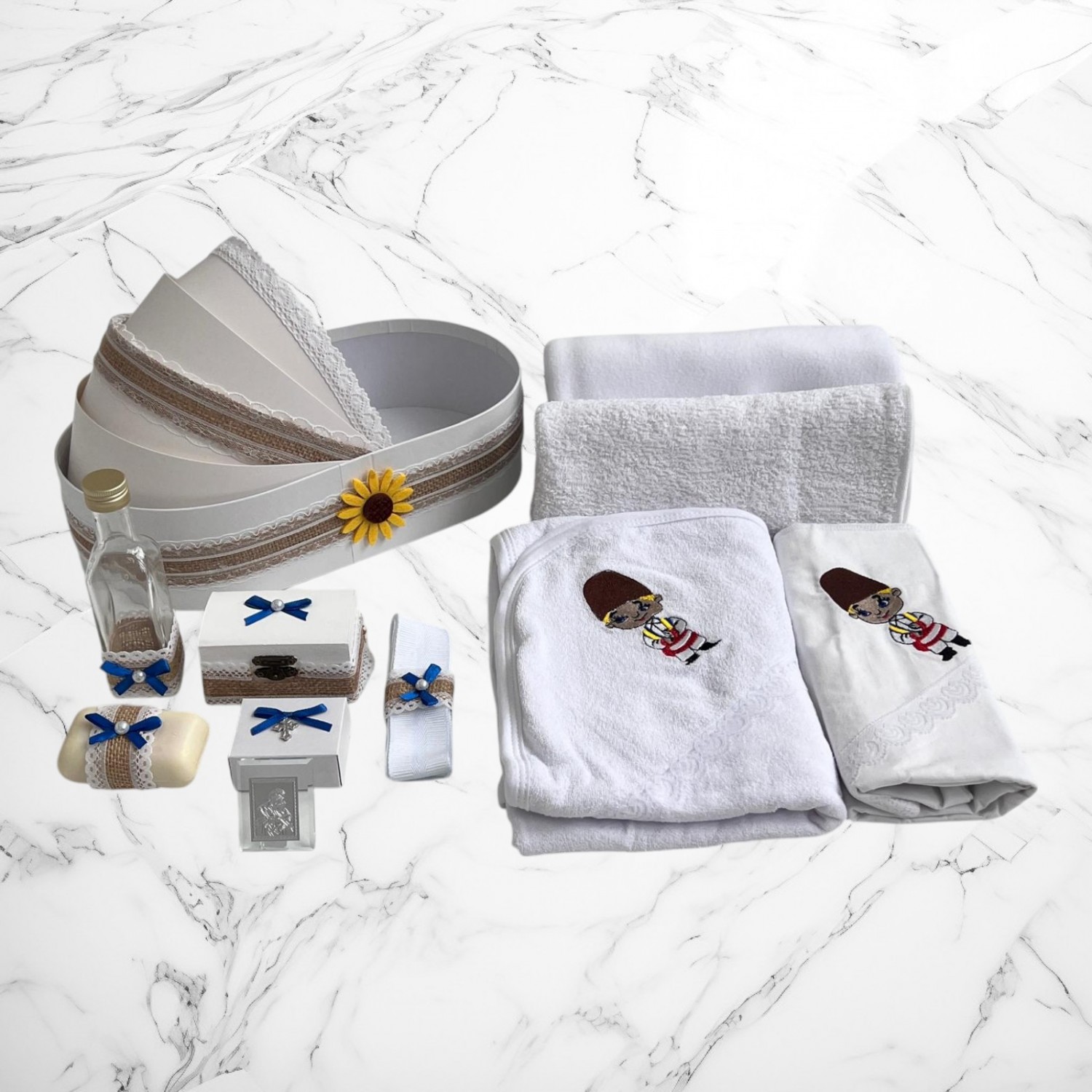 Alege un set de botez tradițional, cu design autentic românesc, perfect pentru ceremonia de creștinare a micuțului tău. Setul conține o lumânare decorată cu motive populare și un trusou complet, realizat din materiale de înaltă calitate, cu dantelă și broderii fine și o cutie pentru hăinuțe.👶✨