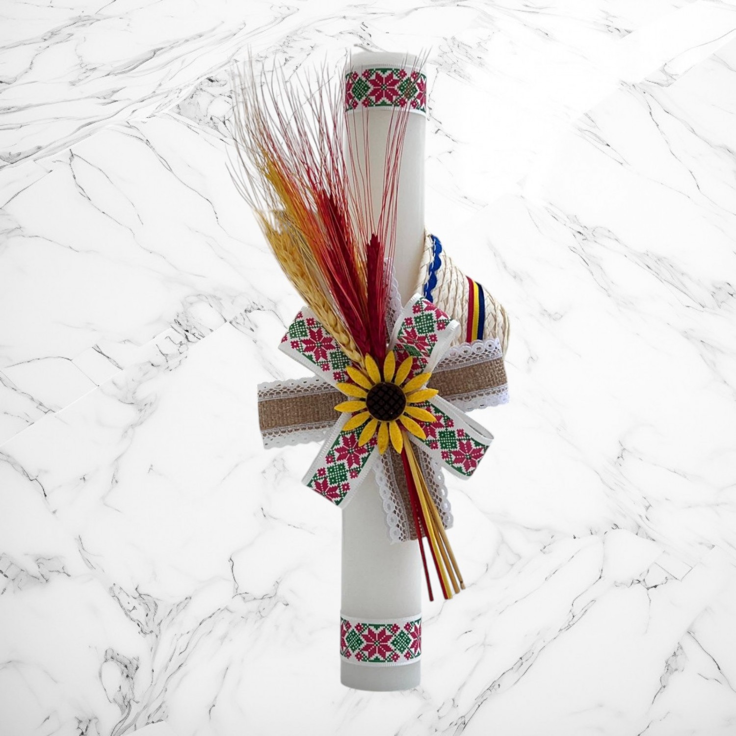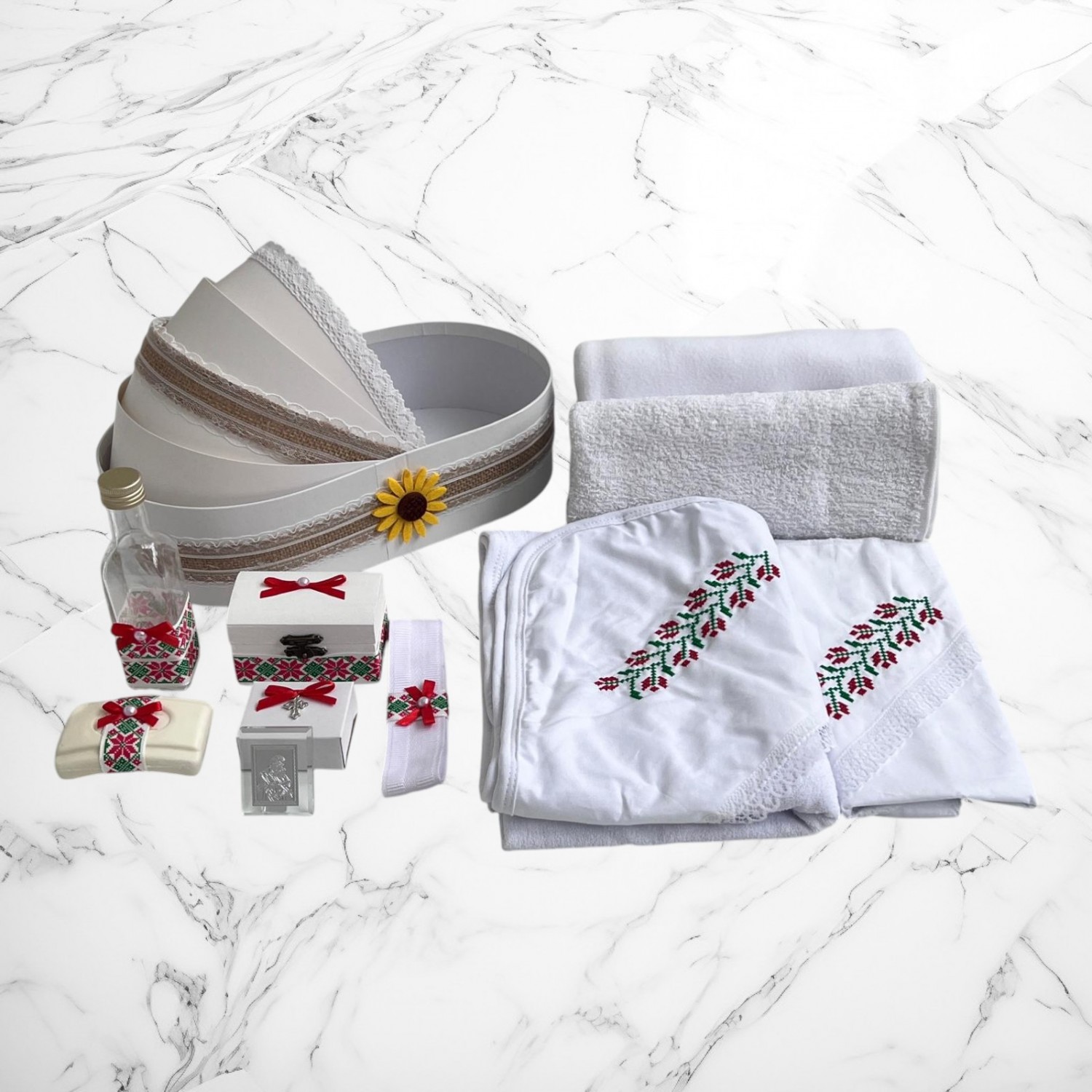 Alege un set de botez tradițional, cu design autentic românesc, perfect pentru ceremonia de creștinare a micuțului tău. Setul conține o lumânare decorată cu motive populare și un trusou complet, realizat din materiale de înaltă calitate, cu dantelă și broderii fine și o cutie pentru hăinuțe.👶✨