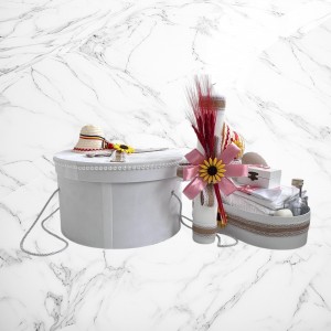 📦 Ambalaj: Toate elementele trusoului sunt așezate într-o cutie albă din carton, în formă de landou, decorată cu fundă și perlute