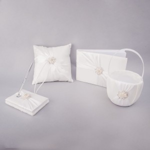 Acest set de nunta superb realizat din tafta satinata este decorat cu panglici din satin dispuse in forma de funda pe fiecare articol din set.