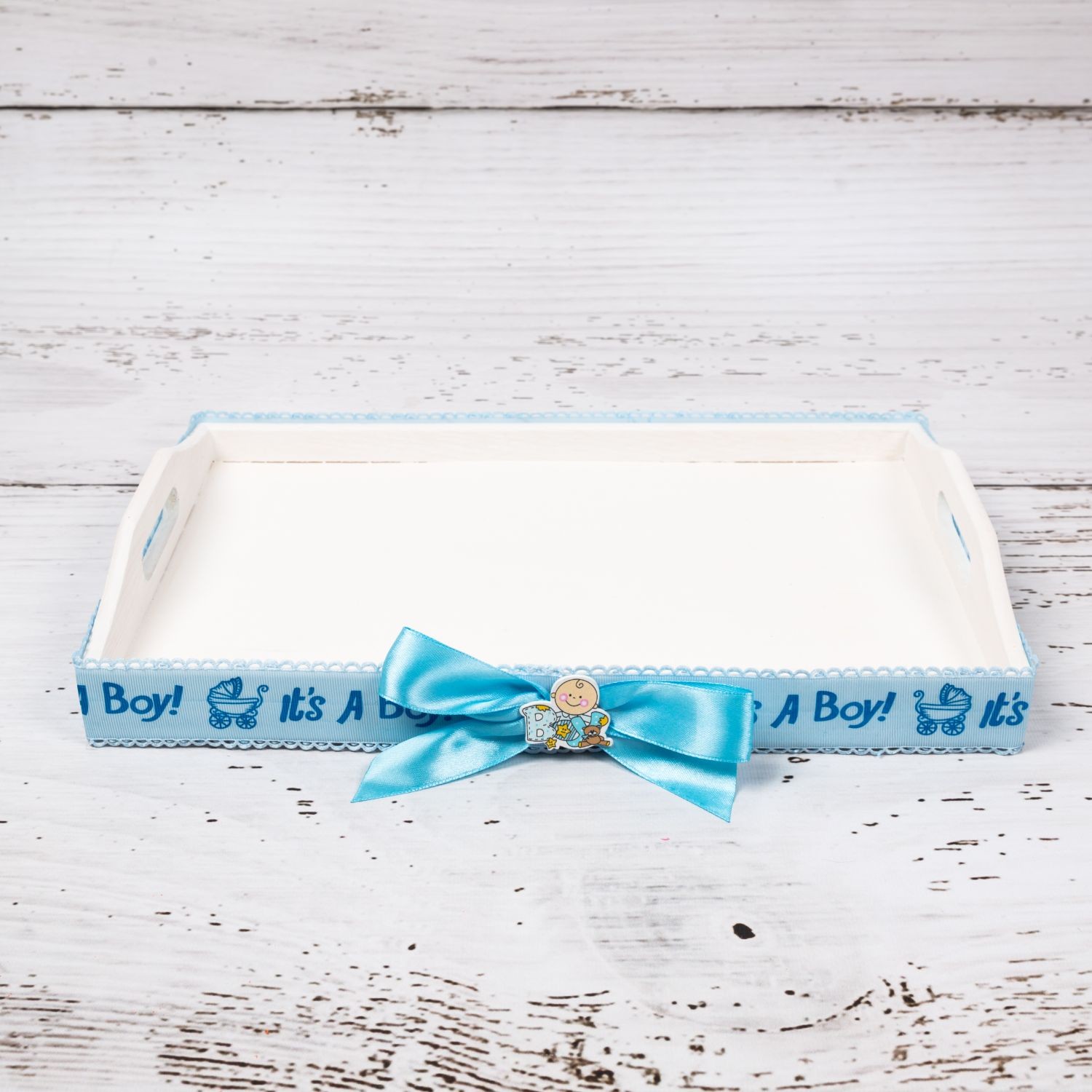 - tavita cu decor banda bleu It s a boy, funda bleu si figurna baietel in mijloc cu mesajul Boy. Dimensiuni tavita: 35 cm x 23 cm x 5 cm (L x l x H).
