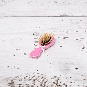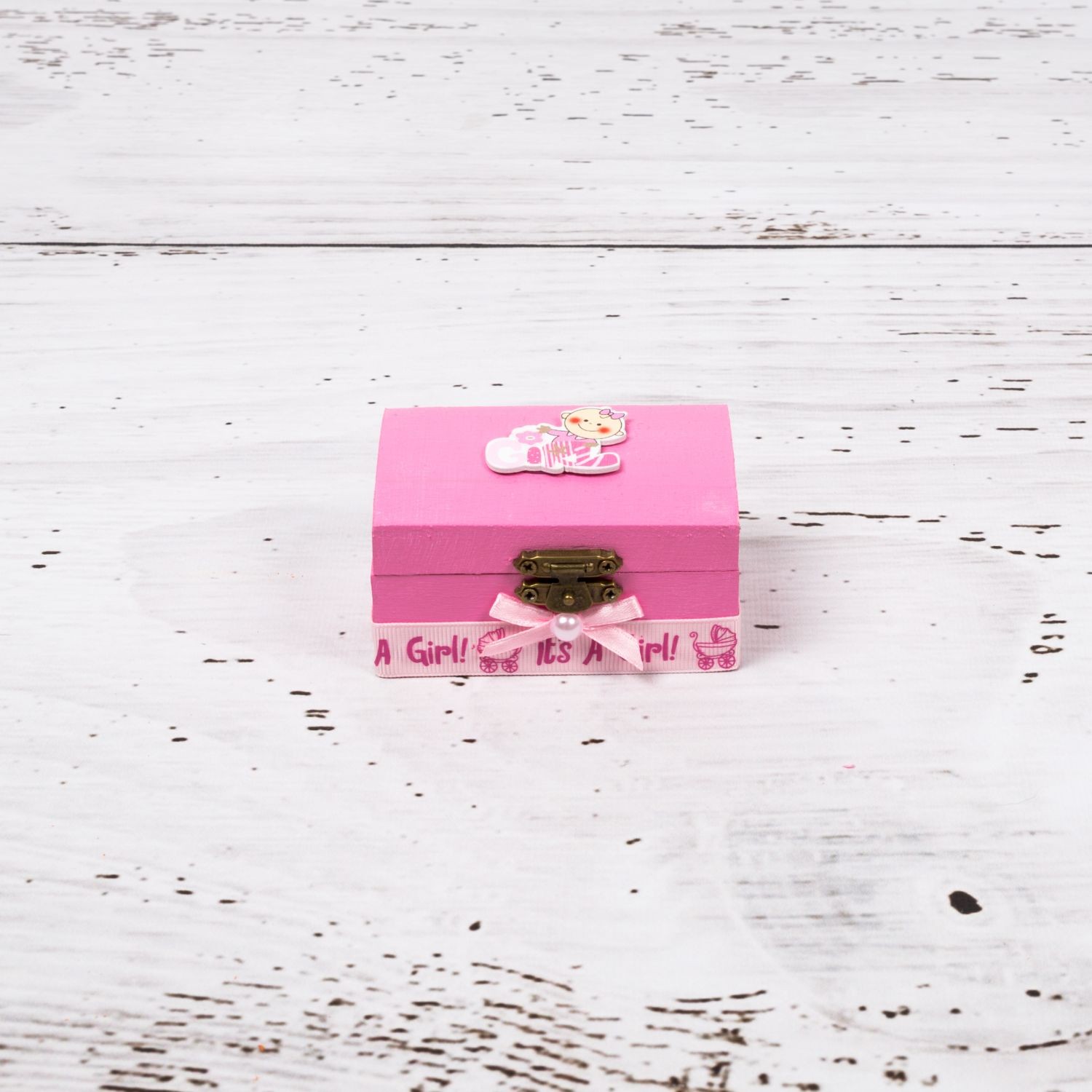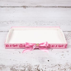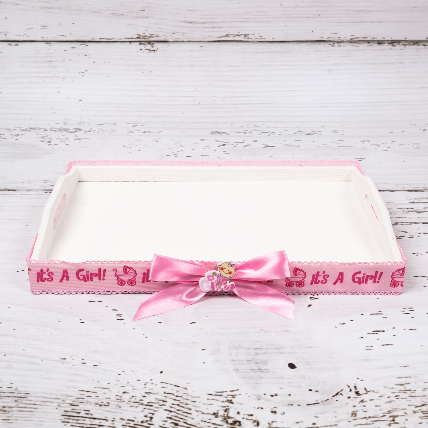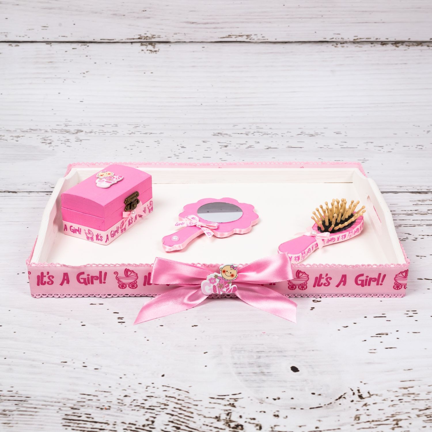 Cele patru articole care alcatuiesc acest set cu banda roz It s a girl, fundite asortate si vopsite in alb (tavita), respectiv roz (perie de par, oglinda, cutiuta prima suvita) sunt decorate manual in Atelierul SelfEvents.ro.