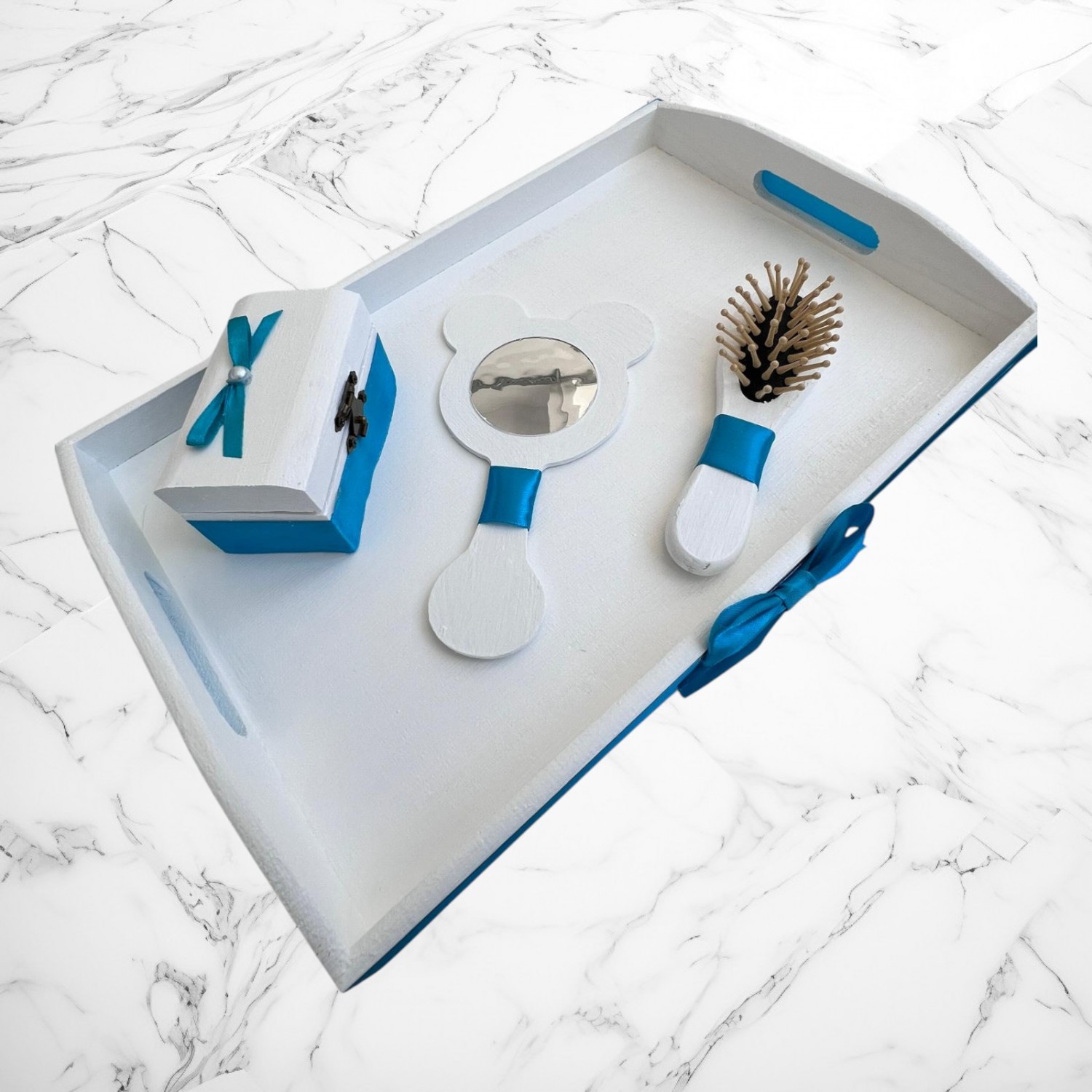 Tăviță decorativă din lemn, vopsită în alb cu accente turcoaz (inclusiv o fundiță laterală) – ideală pentru prezentarea obiectelor într-un mod festiv.
