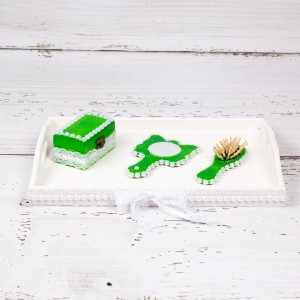 Accesoriile din acest set verde cu sirag de perle si dantela alba au decor lucrat manual. Dupa ce nasa va taia motul copilului, parintii micutului vor pastra in cutiuta in forma de cufar suvita de par in semn de amintire.