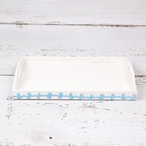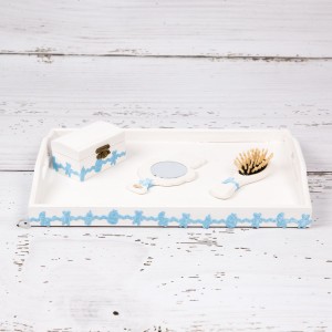 Toate cele patru articole care alcatuiesc setul de mot sunt realizate din lemn si decorate manual cu banda bleu in Atelierul SelfEvents.ro. La petrecerea de mot, tava este necesara pentru a aseza peria de par, oglinda si cutiuta pentru prima suvita.