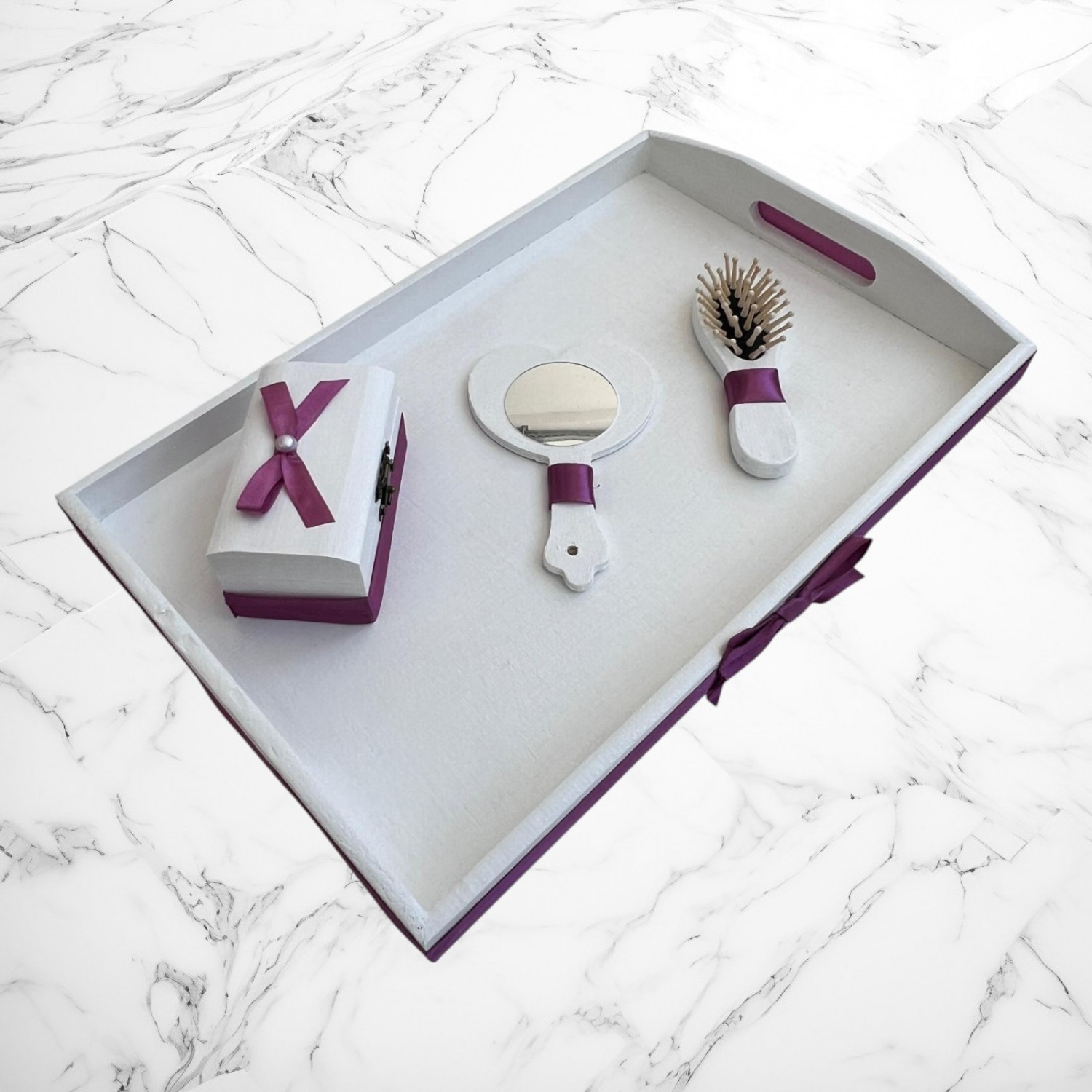 Tăviță decorativă din lemn, vopsită în alb cu accente grena deschis (inclusiv o fundiță laterală) – ideală pentru prezentarea obiectelor într-un mod festiv.