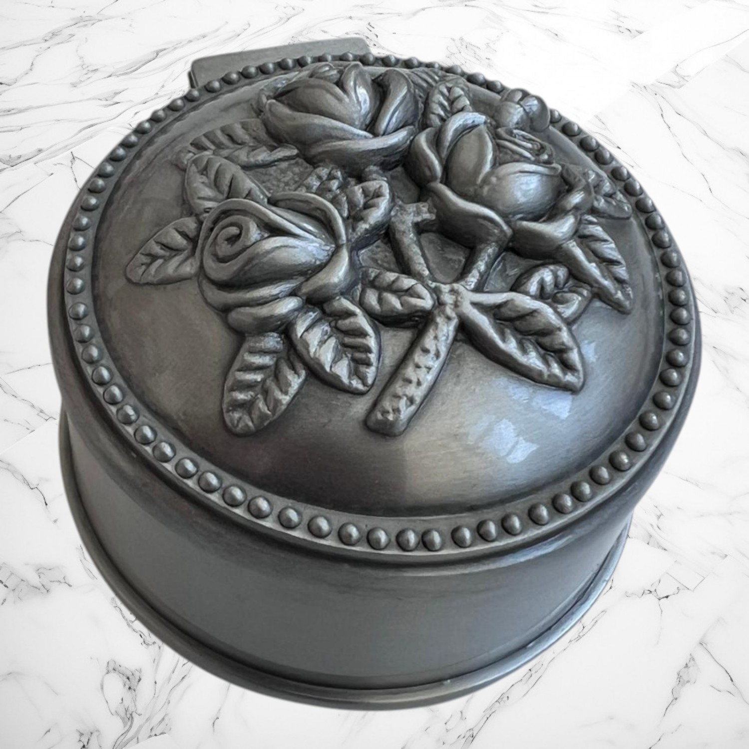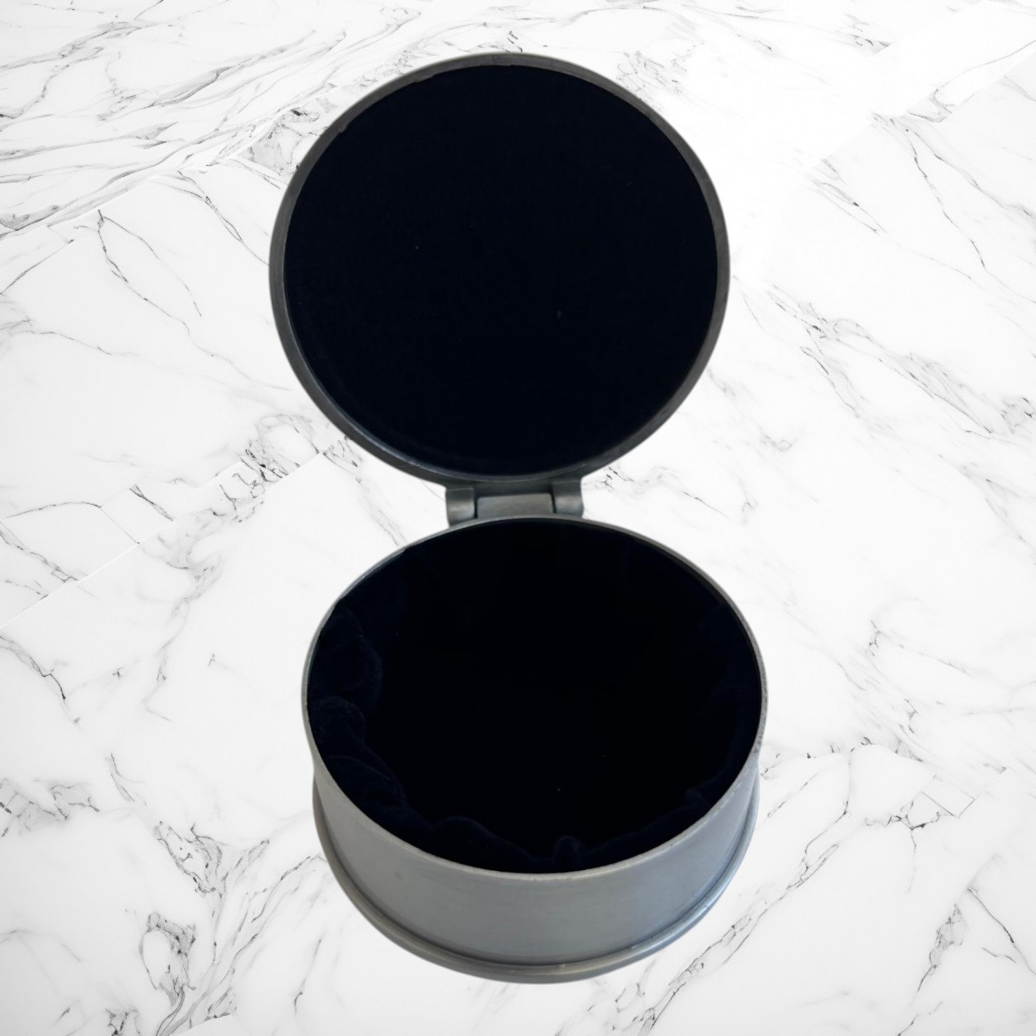 Cutiuță metalică decorativă, pentru păstrarea suviței de păr sau a unei bijuterii.