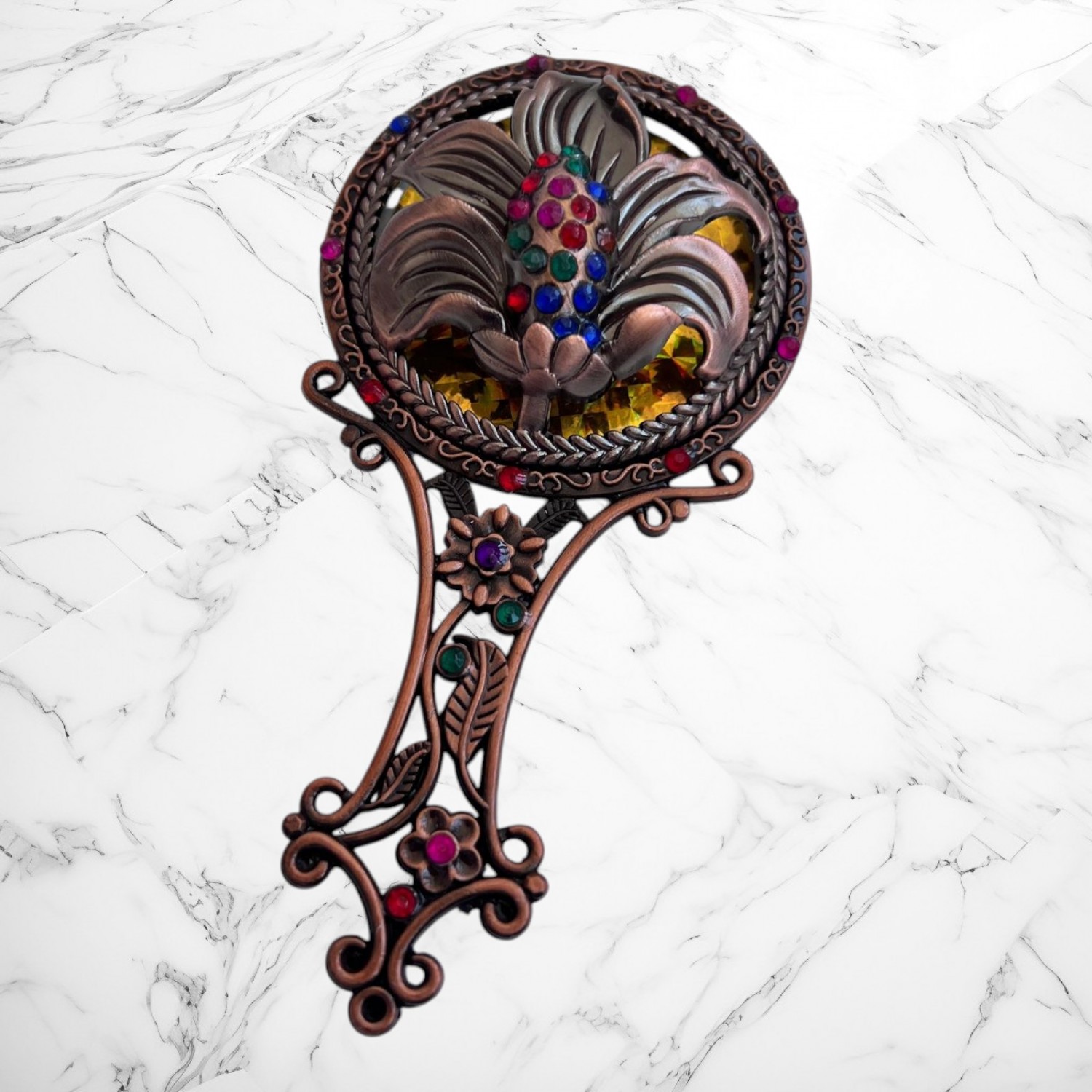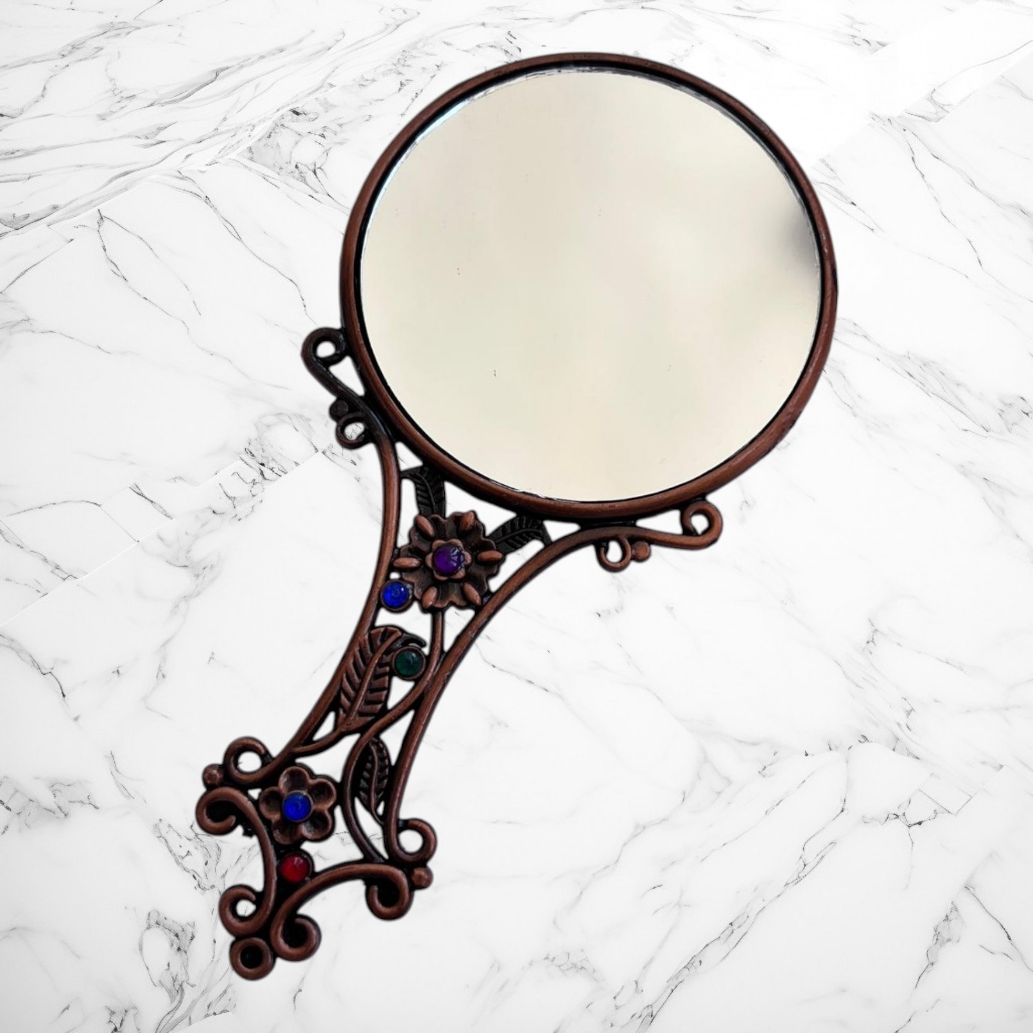 Oglindă de mână metalică cu model vintage, detaliată cu motive florale și pietricele decorative.