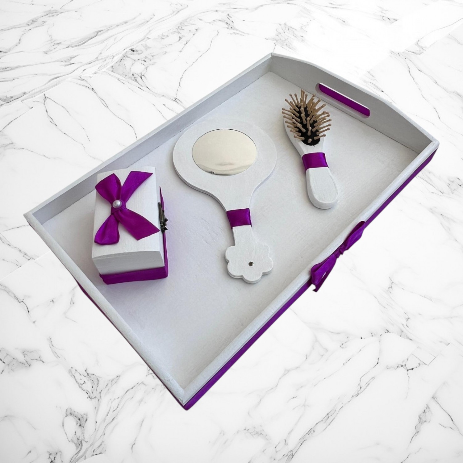 Tăviță decorativă din lemn, vopsită în alb cu accente mov (inclusiv o fundiță laterală) – ideală pentru prezentarea obiectelor într-un mod festiv.