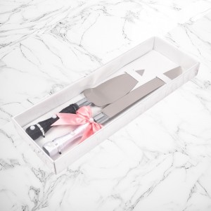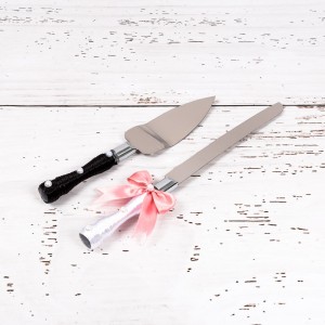 Manerul cutitului este infasurat in snur alb, iar manerul de la paleta in snur negru. Simbolic, cele doua accesorii reprezinta vestimentatia clasica a mirilor, iar ambele tacamuri au ca decor cate o fundita roz, ce poate fi in stransa legatura cu tema evenimentului.