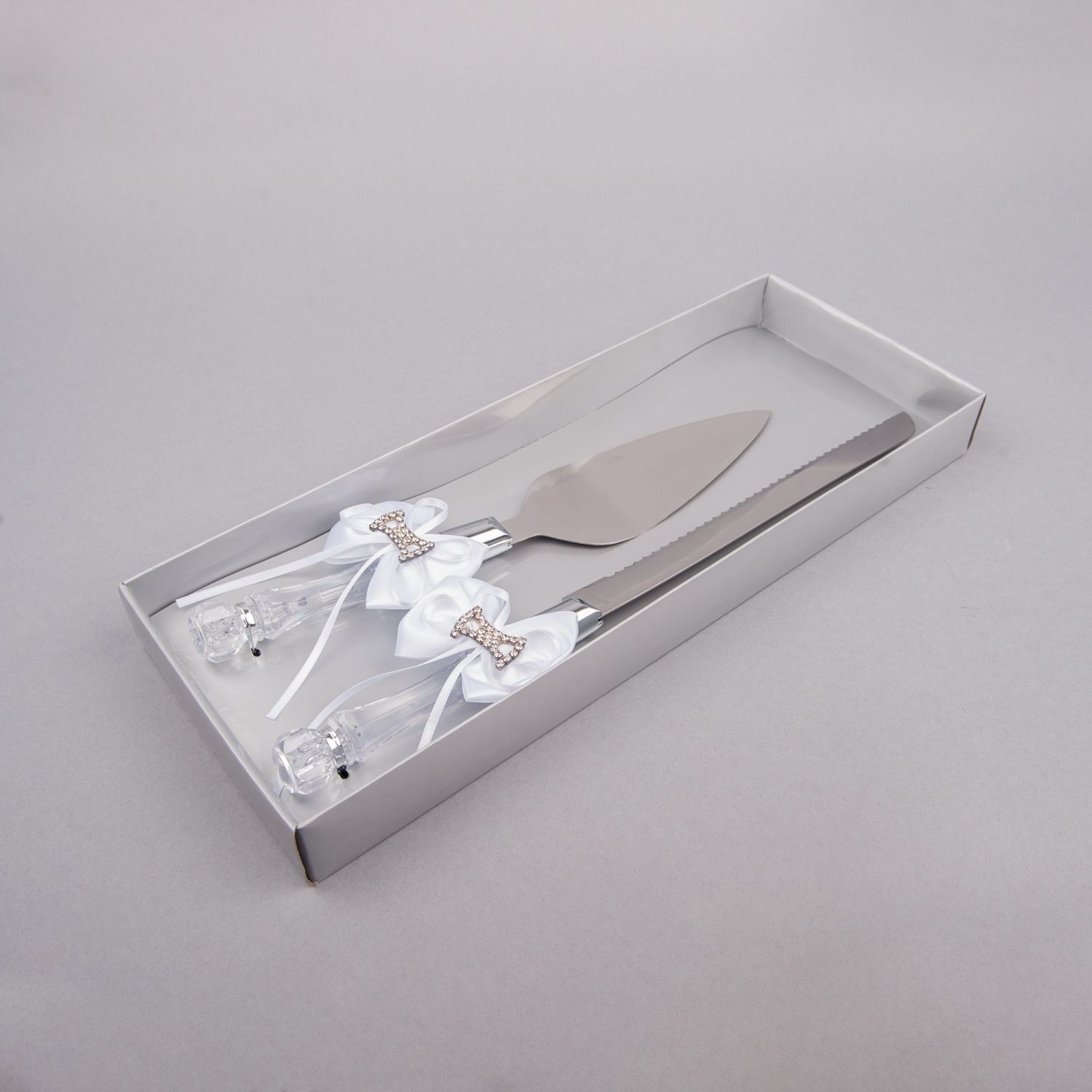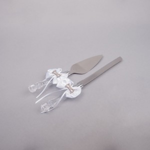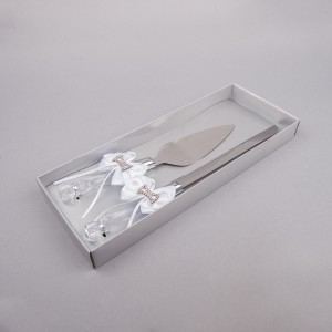 Setul de tort nunta cu fundita alba si pietre strass este un cadou de nunta ideal ce poate fi folosit inclusiv la botez si la alte aniversari speciale.