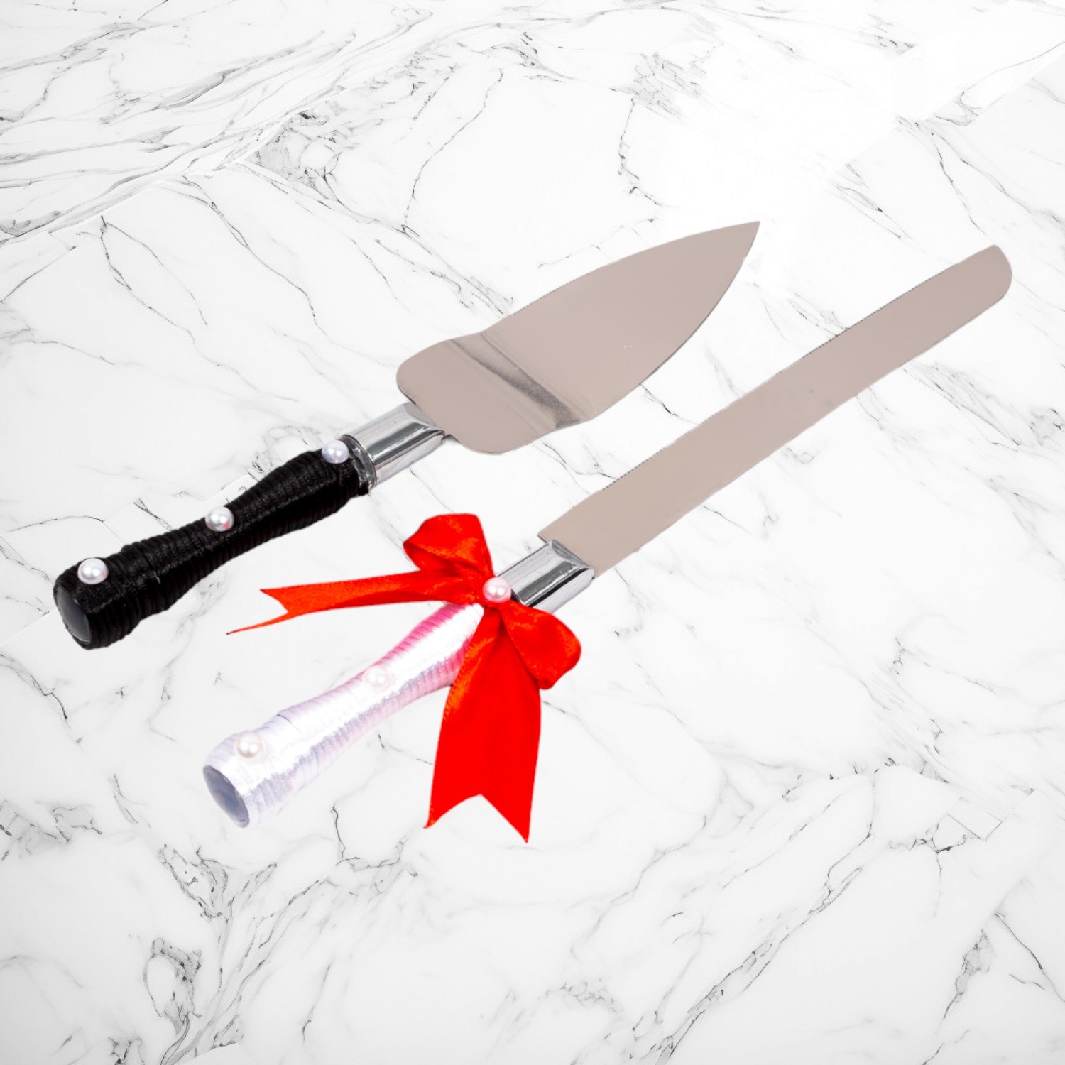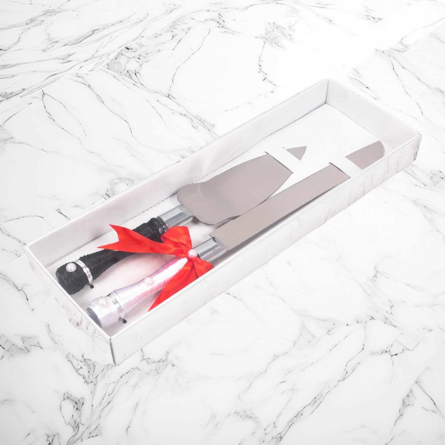 Setul de tort este compus din cutit si paleta, fiecare tacam fiind accesorizat cu cate o fundita satinata rosie si perlute albe.