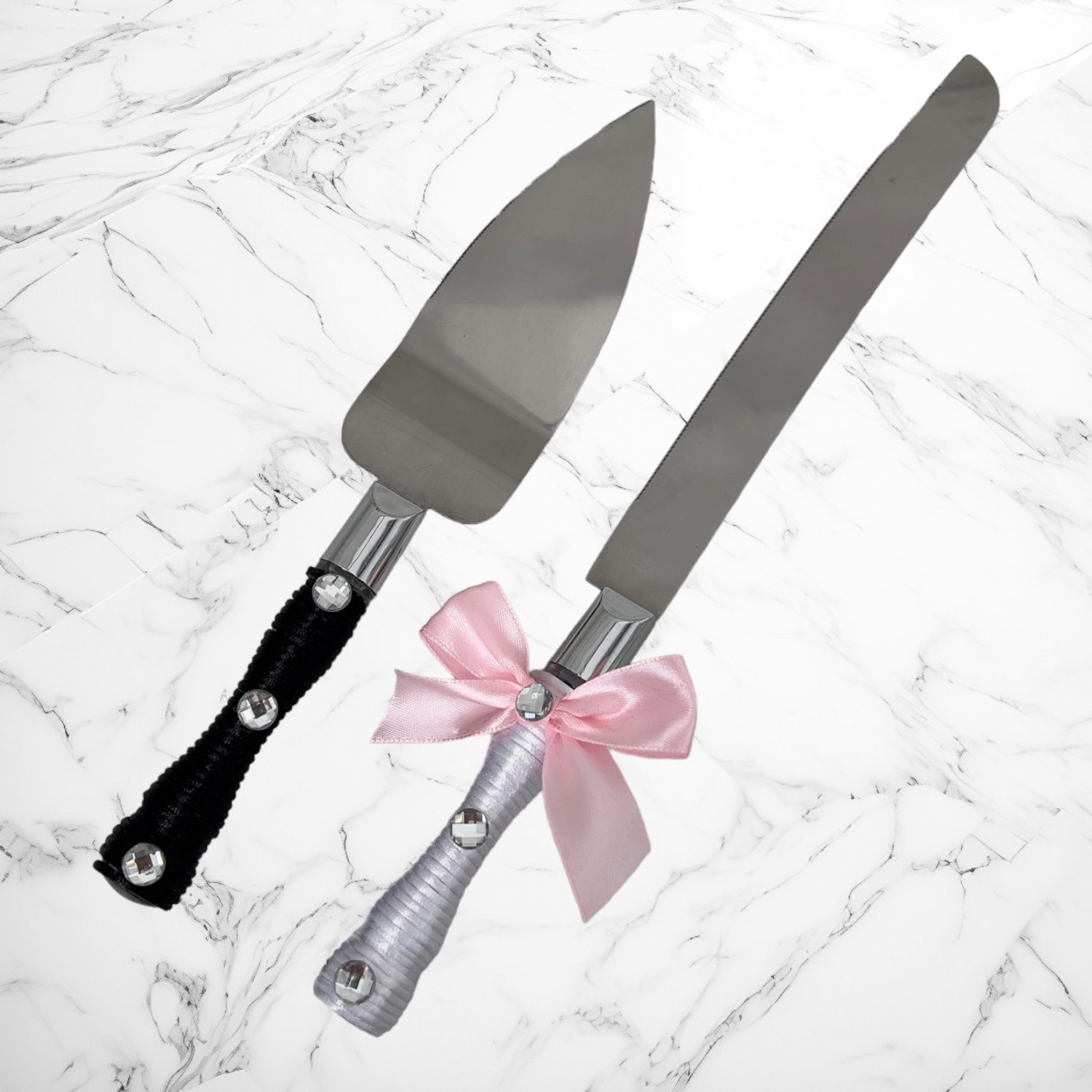 Pentru mirii care prefera accesoriile de tort clasice, setul de tacamuri Mire si Mireasa cu funda roz sunt o alegere ideala. Aceste tacamuri cu snur alb (cutit), respectiv snur negru (paleta) sunt perfecte pentru taierea tortului.