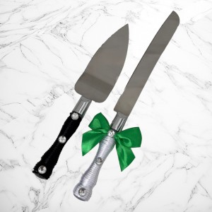 Pentru mirii care prefera accesoriile de tort clasice, setul de tacamuri Mire si Mireasa cu funda verde sunt o alegere ideala. Aceste tacamuri cu snur alb (cutit), respectiv snur negru (paleta) sunt perfecte pentru taierea tortului.