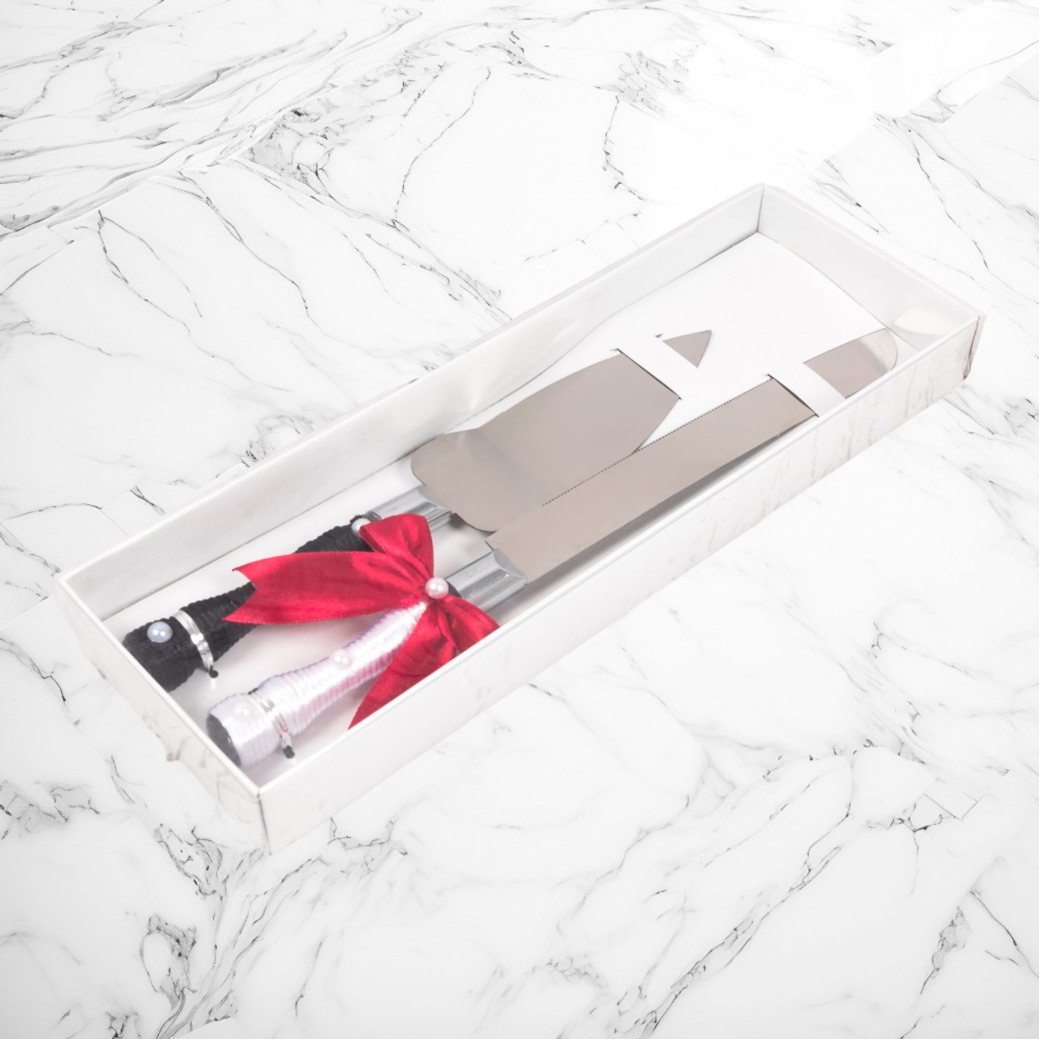Pentru o nunta romantica in culori puternice, tinerii insuratei pot alege un set tacamuri tort nunta Miri cu fundita bordo si perlute albe, astfel incat momentul in care se taie tortul si se ciocnesc paharele de sampanie sa fie unul cu adevarat special.