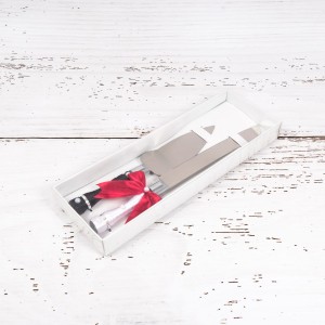 Setul de tort este compus din cutit si paleta, fiecare tacam fiind accesorizat cu cate o fundita satinata bordo si perlute albe.