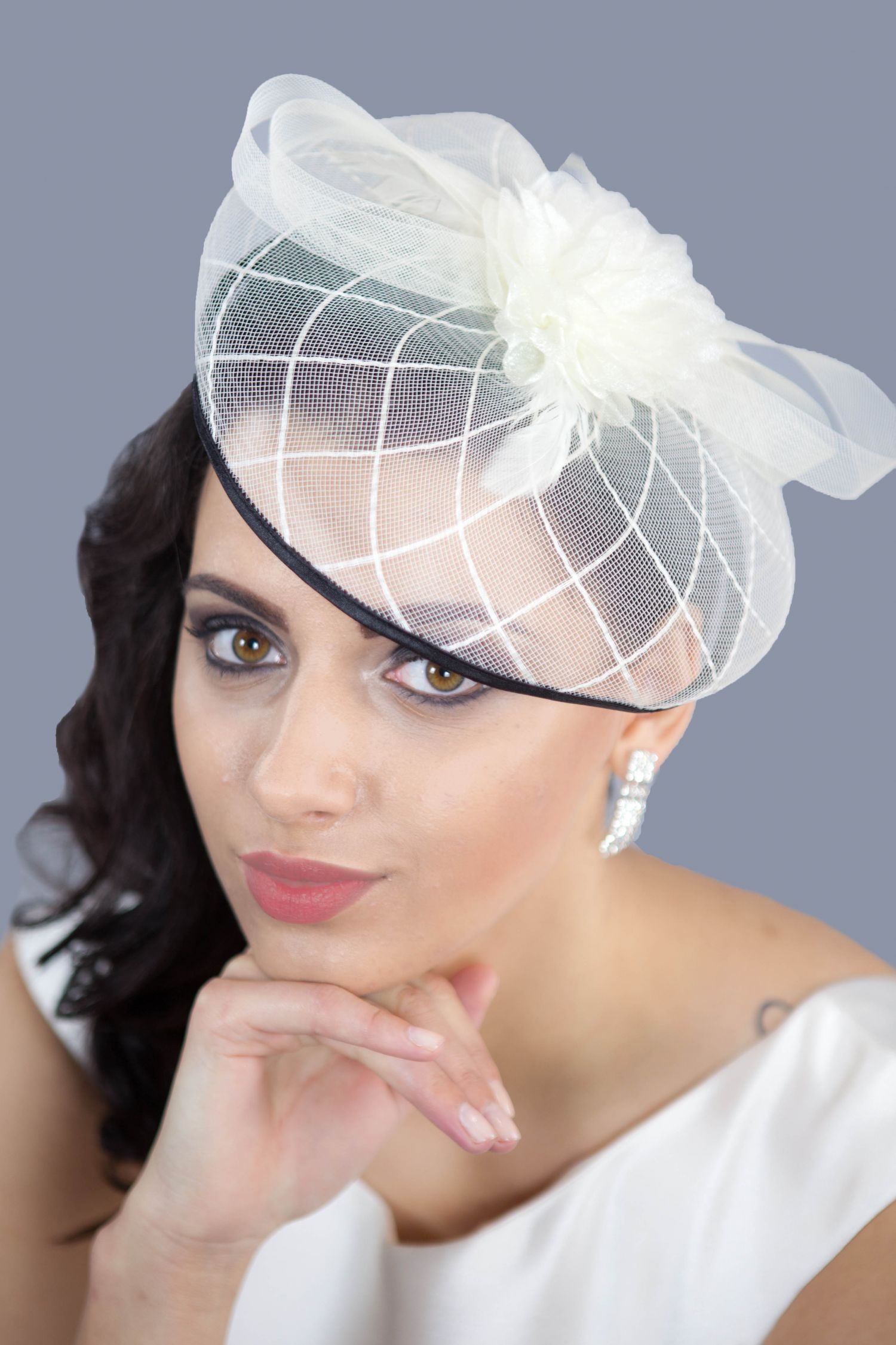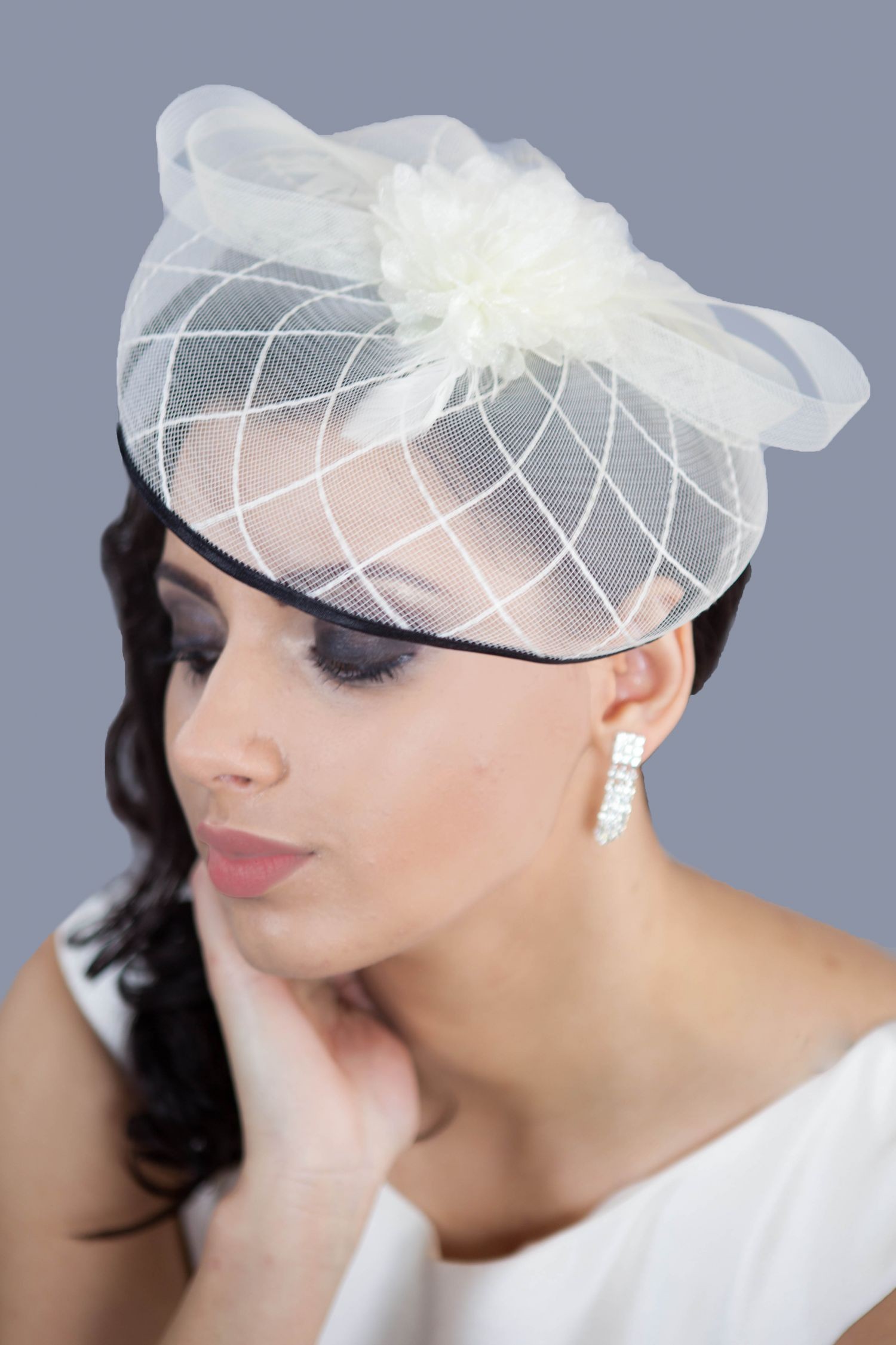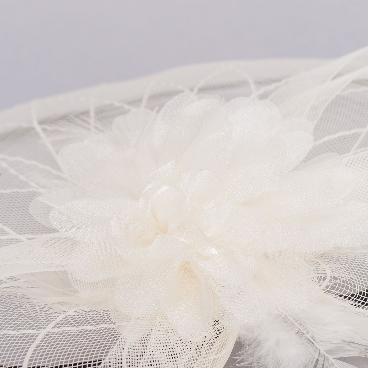 Voaleta este decorata in centru cu o floare eleganta, puf si o panglica de Sinamay, tip plasa.
