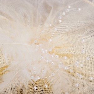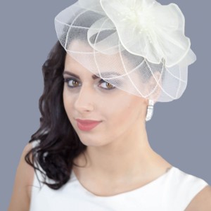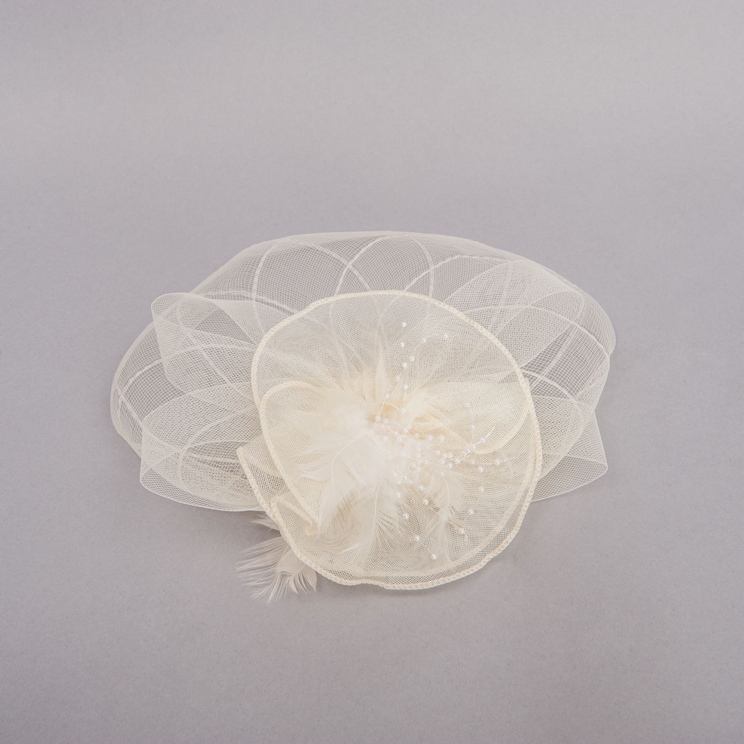 Voaleta de mireasa Beverly are o baza tip plasa din material rezistent, numit Sinamay si un accesoriu floare, cu margele si puf, din aceeasi tesatura, dar cu ochiuri mai dese.