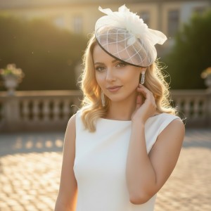 Voaleta este decorata in centru cu o floare eleganta, puf si o panglica de Sinamay, tip plasa.