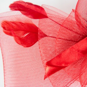 Voaleta de ocazie Barbara, realizata dintr-un material originar din Filipine are plasa si este decorata cu fundita din satin rosu si pene in aceeasi culoare.