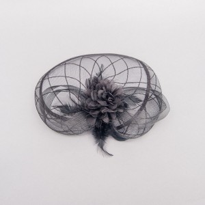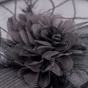 Aceasta este impodobita cu o floare mare din poliester si pene.