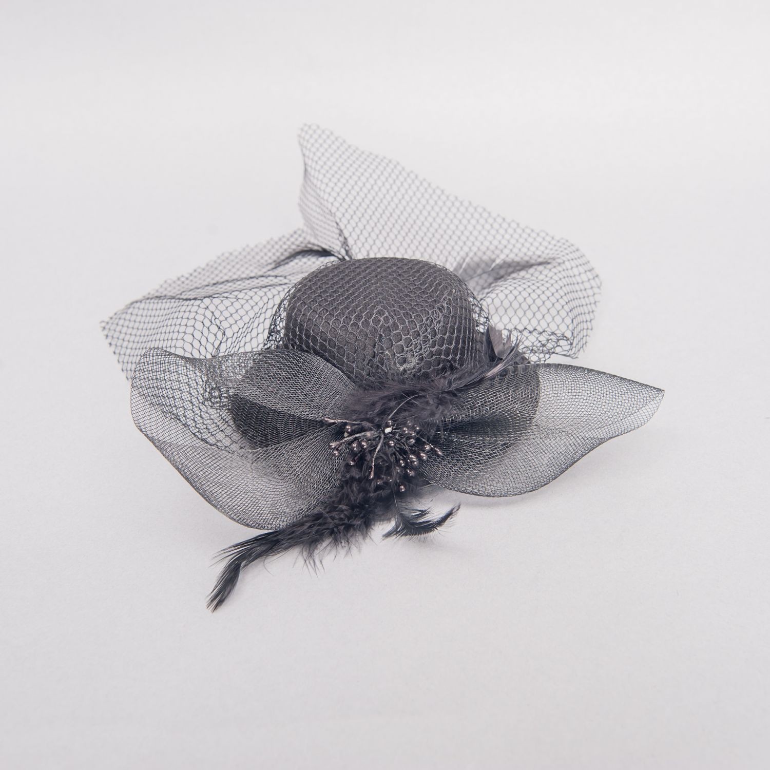 Voaleta de ocazie Brook, neagra este de forma unei palarii miniaturale si este decorata cu plasa, puf si material dur de Sinamay.
